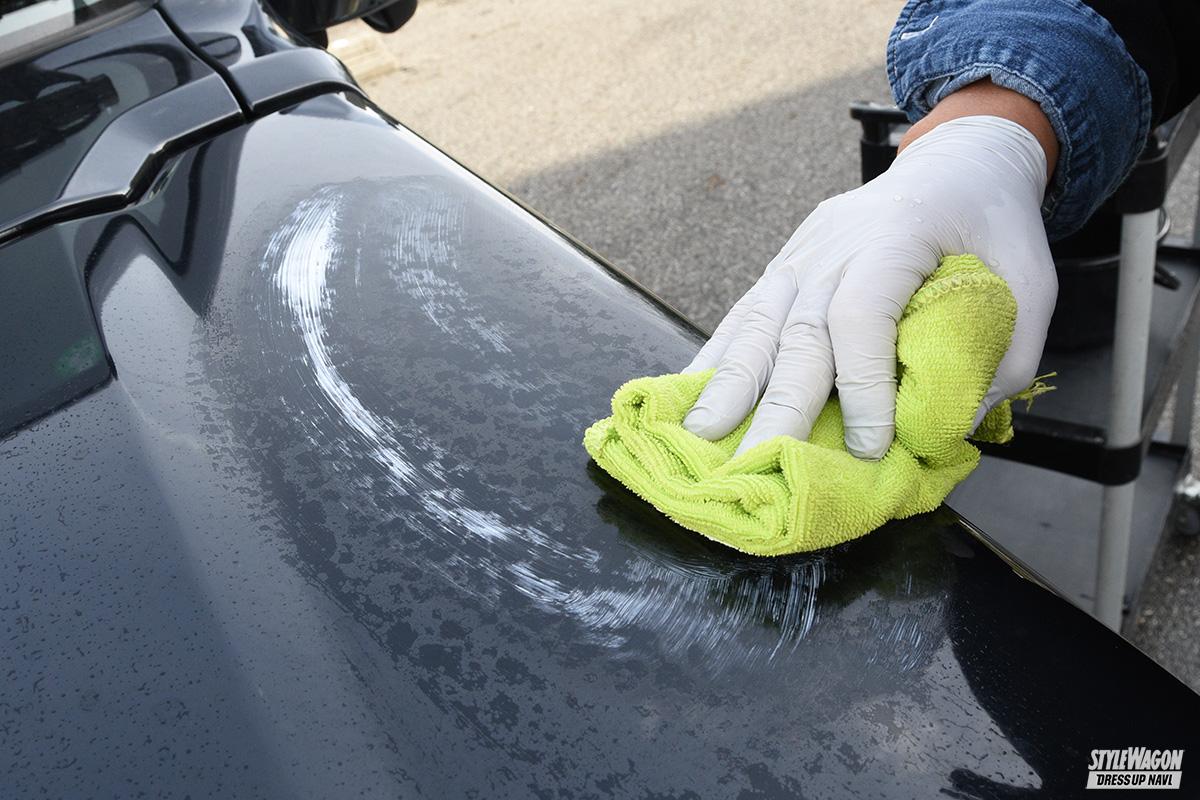 ③ 力を入れず、軽くボディ表面を擦っていく。これによりしっかりと イポンデポジットが除去できる。液剤が乾いてきたら注ぎ足そう。