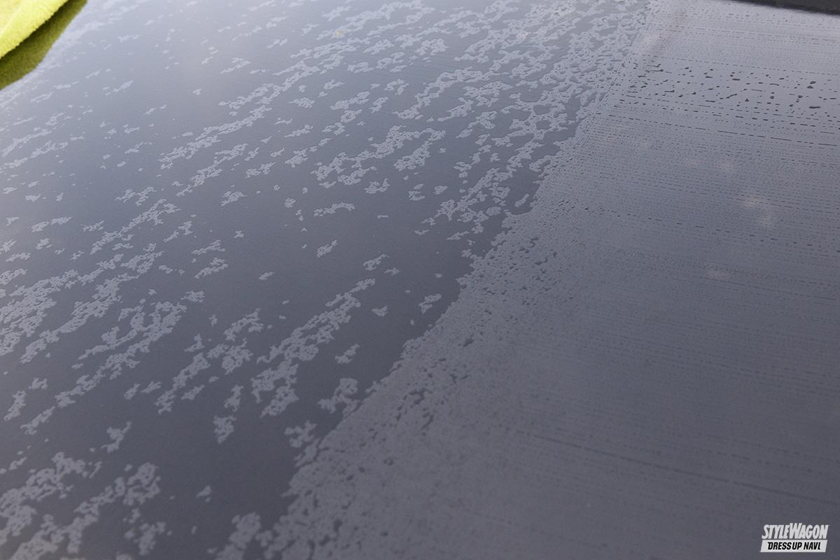 周囲の水を引き込んでいく疎水性のコーティングが掛かるのも特徴。しっかりと水が引けていくから、青空駐車で汚れ目立ちに悩む方はチェックしてみて欲しい。
