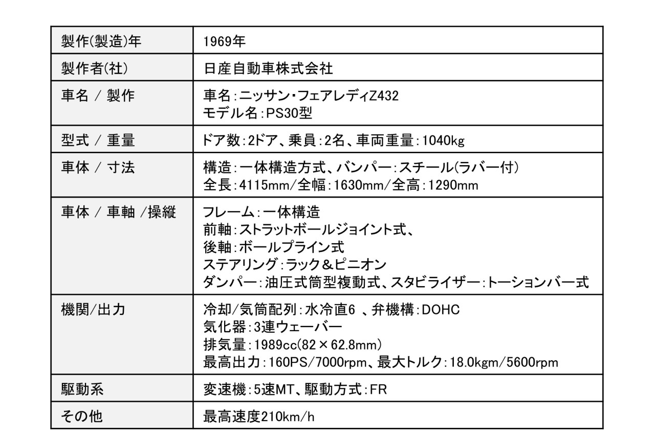 【フェアレディZ432 車両詳細】 年式:1969年 型式:PS30型 全長×全幅×全高:4,115×1,630×1,290mm ホイールベース:2,305mm トレッド(前/後):1,355/1,345mm 車両重量:1,040kg エンジン:S20型(直6 4バルブ DOHC) 排気量:1989cc 最高出力:118kW(160ps)/7000rpm 最大トルク:177N・m(18.0kgf・m)/5,600rpm サスペンション(前/後):ストラット/ストラット(独立) ブレーキ(前/後):ディスク/ドラム(アルミフィン付) タイヤ:6.95-H14-4PR その他:1969年10月発表、11月発売/1978年6月生産終了