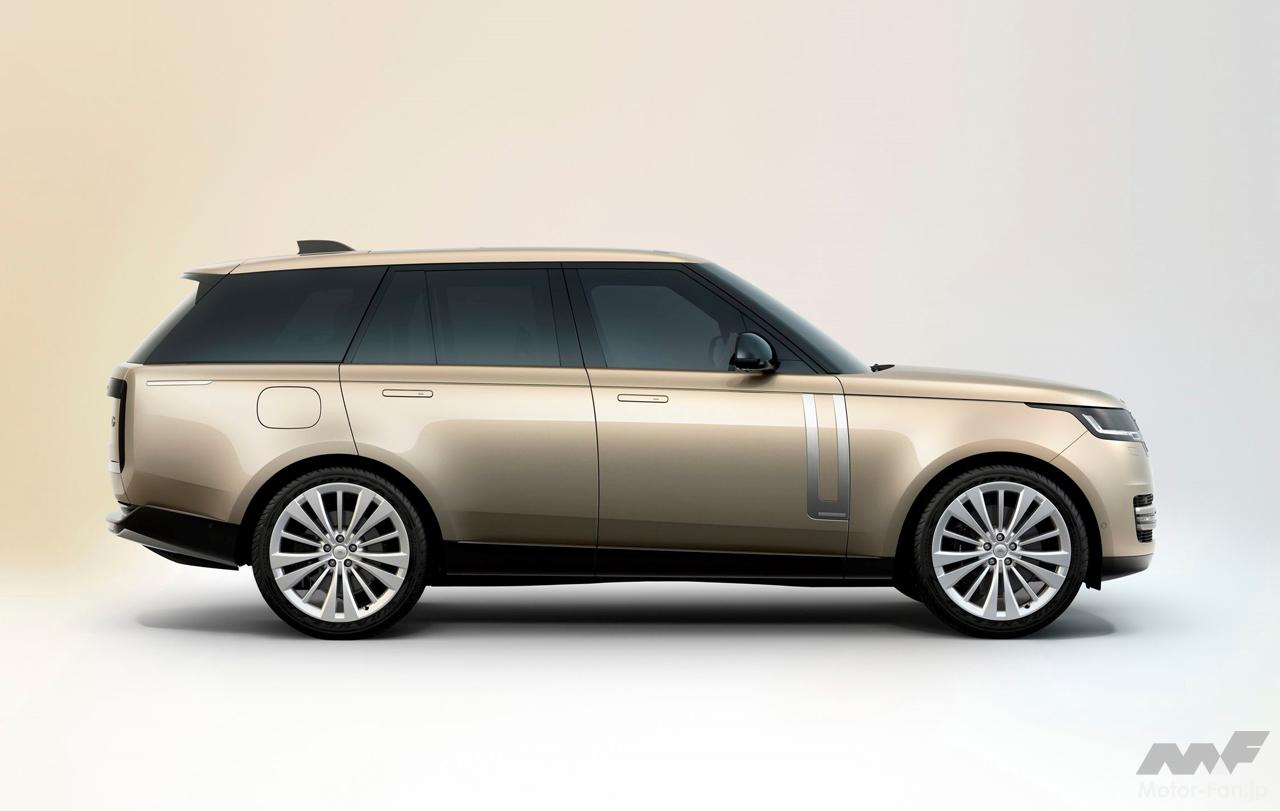 新型レンジローバーは、世代を超えて受け継がれてきた特徴的な3つのライン(ルーフ、ウエスト、シル)やショートオーバーハング、格式高いフロントエンド、直立したフロントガラス、テーパー形状でボートテールのようなリヤなど、「RANGE ROVER」のプロポーションを定義づける要素がちりばめられている。そして、フラッシュグレージング、目立つことのないウエストレールフィニッシャー、シームレスなレーザー溶接ルーフジョイントなどの最新技術を駆使して、凹凸のないサーフェイスや、点灯するまでその存在に気づかない画期的なリヤランプも実現した。