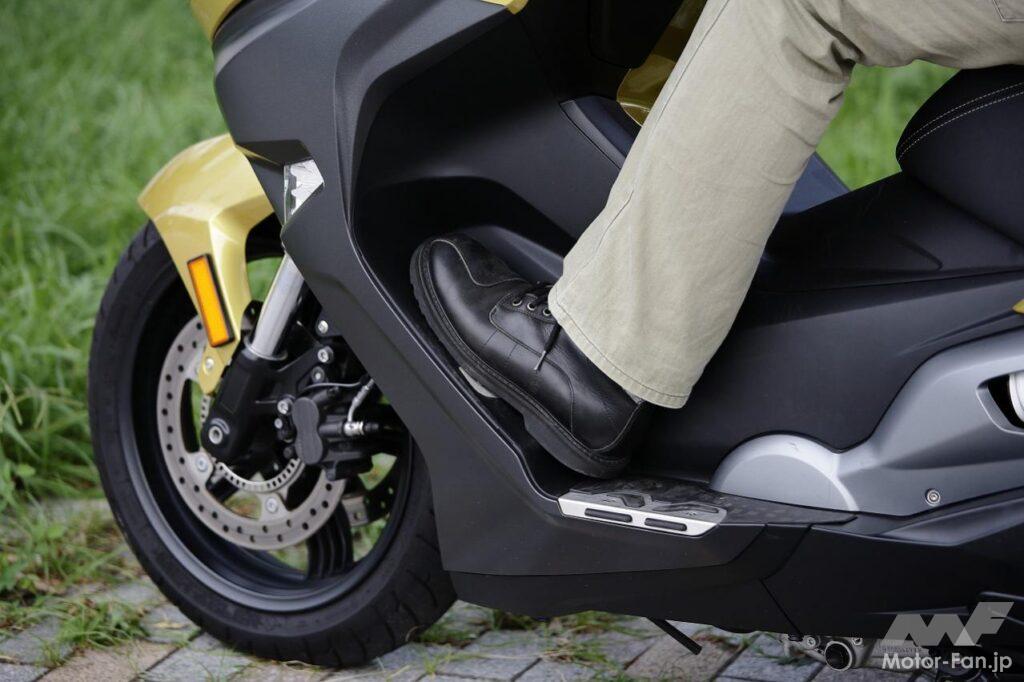 車両重量は249kgあるので、250~400ccクラスのスクーターとは違って取り回しに重さを感じるが、センタースタンドが驚くほど軽く掛けられて「ホントに250kg近くあるの!?」と疑問に思ってしまった。またがってみると、欧州車独特の腰高なシート位置とやや前傾姿勢がしっくりくるポジションがスクーターらしからぬ印象を与える。