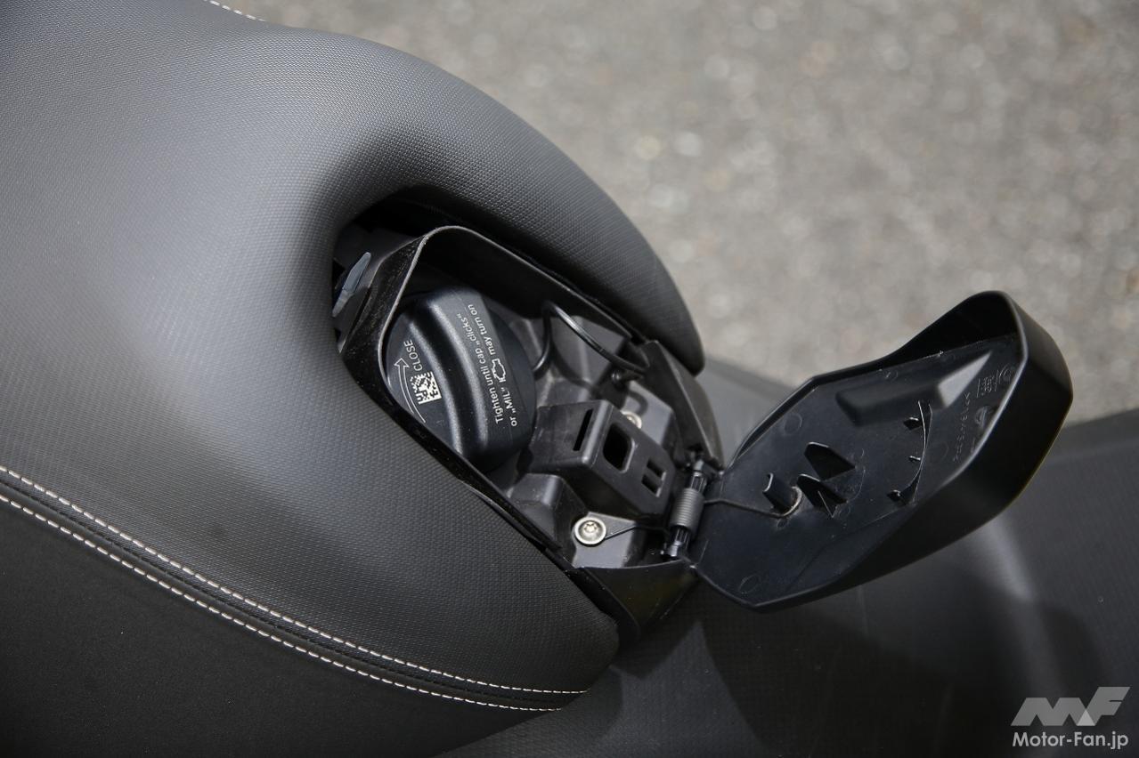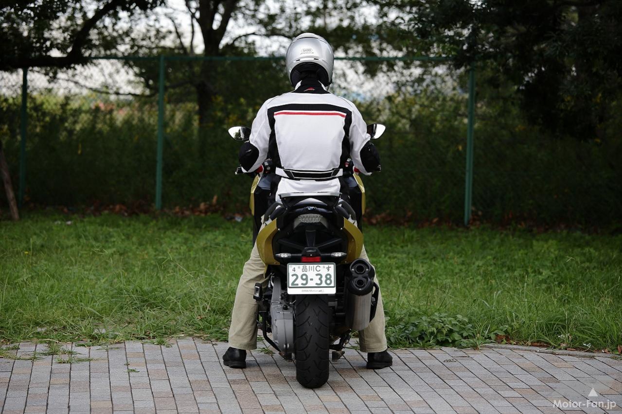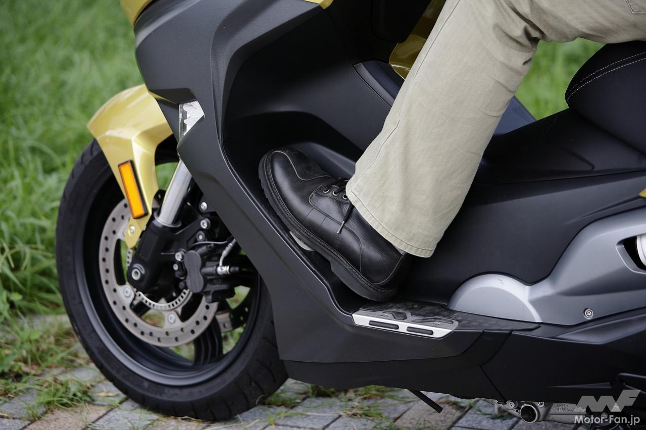 車両重量は249kgあるので、250~400ccクラスのスクーターとは違って取り回しに重さを感じるが、センタースタンドが驚くほど軽く掛けられて「ホントに250kg近くあるの!?」と疑問に思ってしまった。またがってみると、欧州車独特の腰高なシート位置とやや前傾姿勢がしっくりくるポジションがスクーターらしからぬ印象を与える。