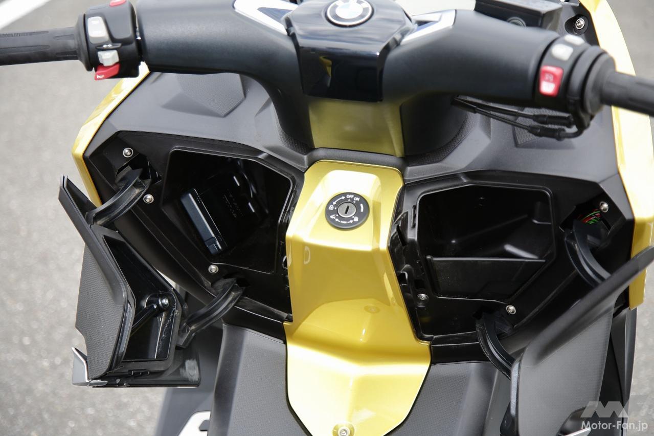 一般的にスクーターはユニットスイングの懸架方式でパワーユニットが後方にレイアウトされるため、構造上リヤヘビーになりやすい。そうなるとフロントの荷重が足りず、フラつきやすくなるが、C650 Sportはエンジンを可能な限り前方向に配置し、チェーンドライブ&スイングアーム方式を採用することで前後の重量バランスを整えている。BMWのスクーター、Cシリーズはスペース的なメリットよりもマスの集中化を優先させており、シリーズの切り込み隊長であるC650 Sportも当然例外ではないのだ。これによって、フロントが極端に軽くなることなく、軽快感を生み出すことに成功している。