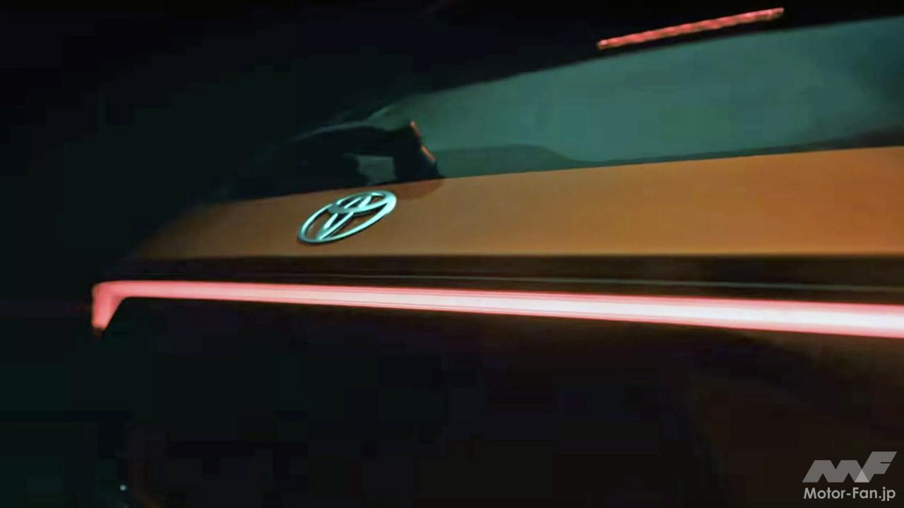 暗闇に浮かぶエクステリアデザインからは、ランドクルーザー300シリーズを彷彿とさせるスプリットヘッドライトに、LEDグラフィックスを備えていることが明らかになっている。また、トヨタのエンブレムが付いたグリルや、全幅LEDテールライトも確認できる。