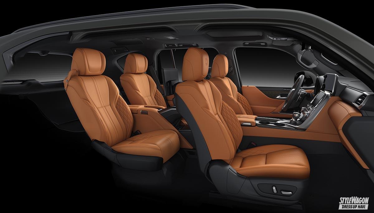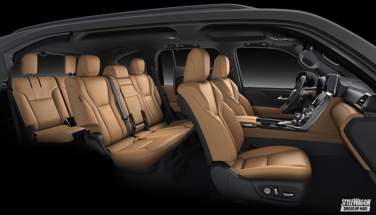 この新型「LX」には、先に発売された「NX」に続く次世代デザインが採用された。7つのフローティングバーによる立体的な新しいスピンドルグリルや、レクサス最大径となる22インチ鍛造アルミホイールの採用など、フラッグシップに相応しい力強さと存在感に溢れたエクステリアが表現されている。