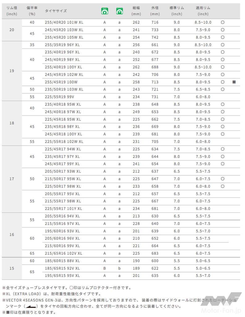●「ベクター4シーズンズGEN-3 SUV」サイズラインナップ