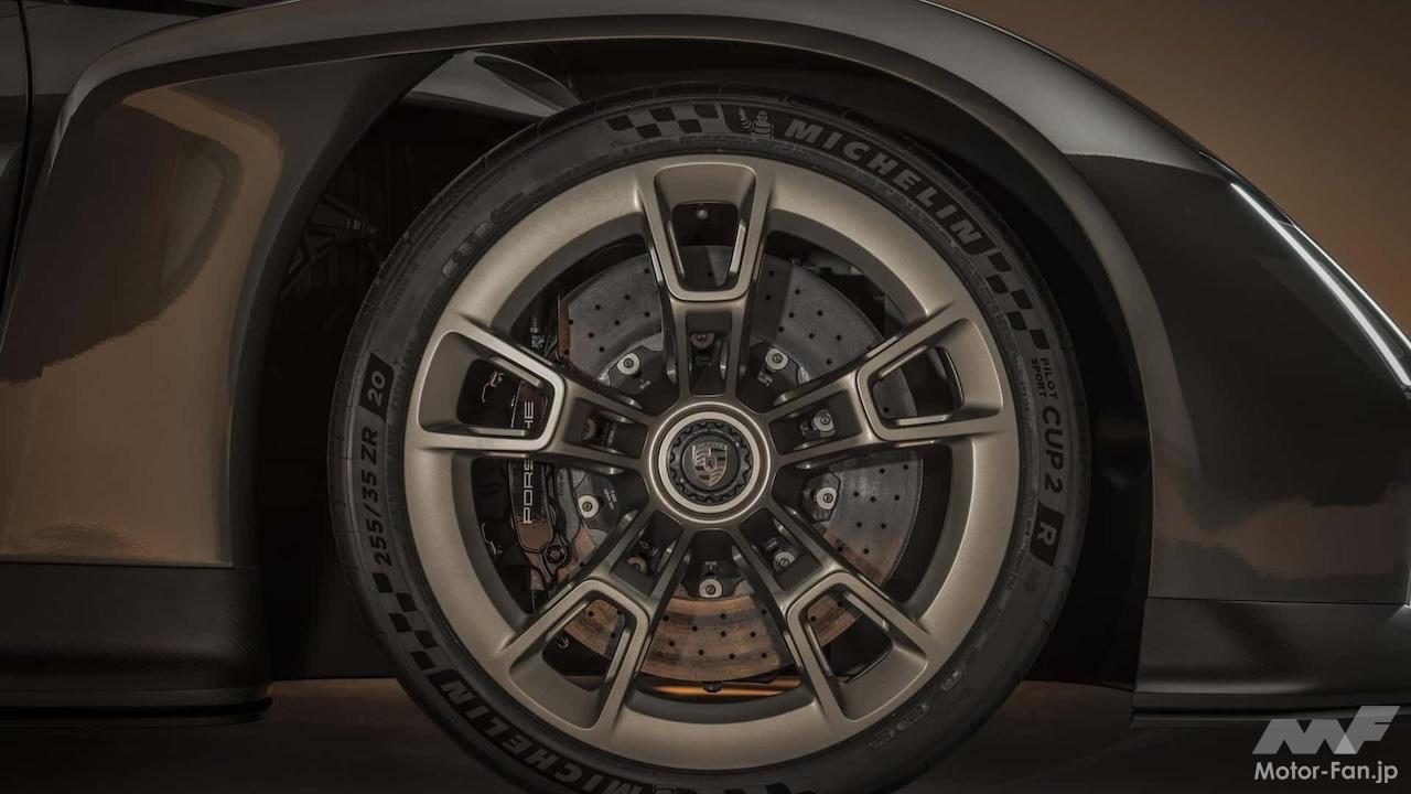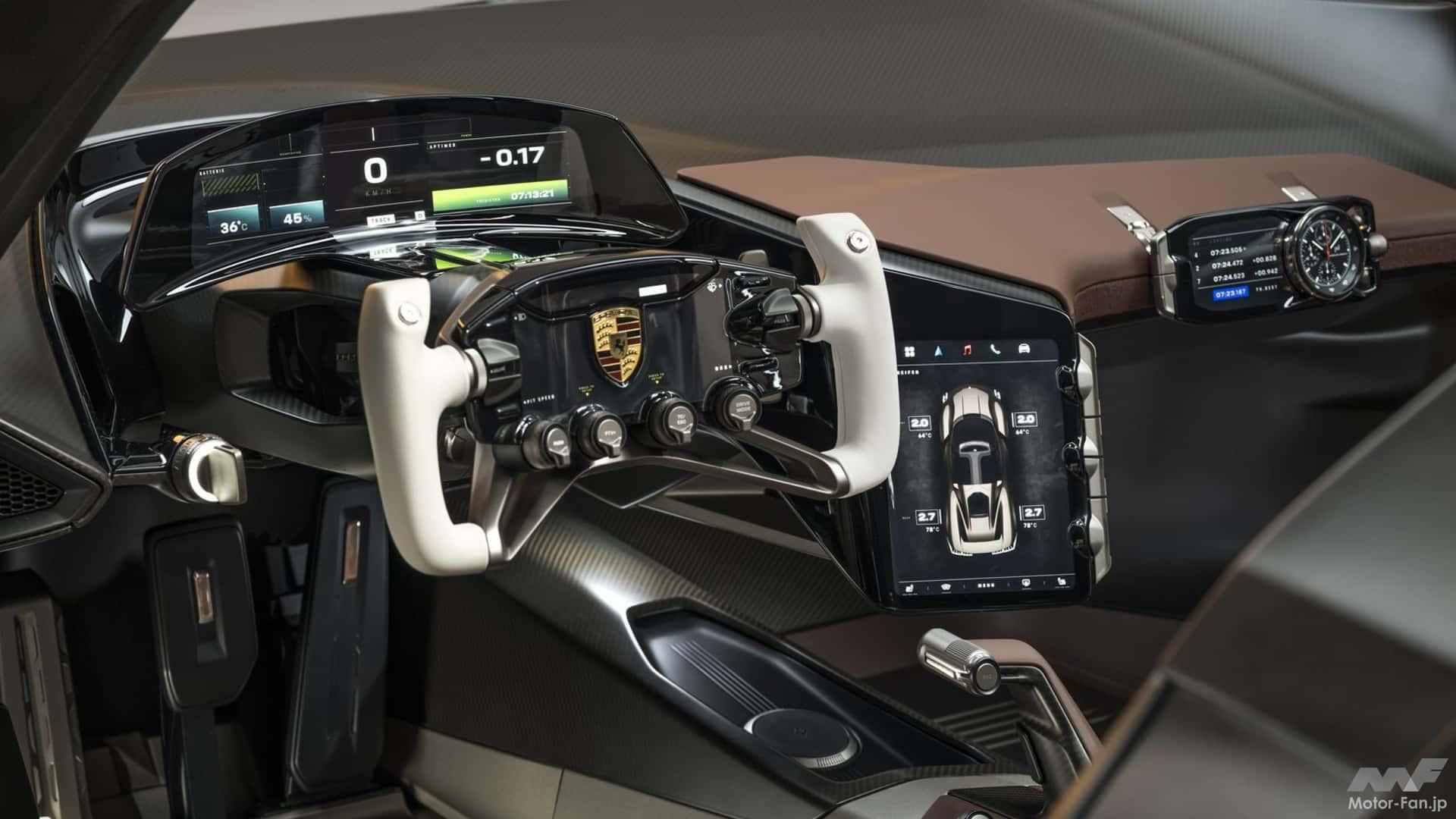 ガラスバブルルーフで覆われたインテリアでは、深いバケットシート、コントラストのあるカラー、露出したカーボン、6点式ハーネス、F1をイメージしたステアリングホイールが並ぶ豪華なキャビンを装備している。ガラス製のキャビンは統合されたスポイラーを備え、両側のスリムなテールライト中央には照明付きの「PORSCHE」ロゴが配置されている。市販バージョンにどこまで反映されるか不明だが、最新情報によれば多くの要素が盛り込まれるのだという。