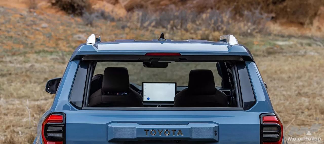 初公開のリヤセクションでは、現行型と異なり、テールゲートの「4Runner」バッジは、トヨタバッジの下ではなく、バンパーのすぐ上に下向きに再配置された。またバンパーも現行4ランナーとは対照的にシルバー塗装となっているほか、C字型テールライトを装備、その周りに黒い輪郭が施されている。