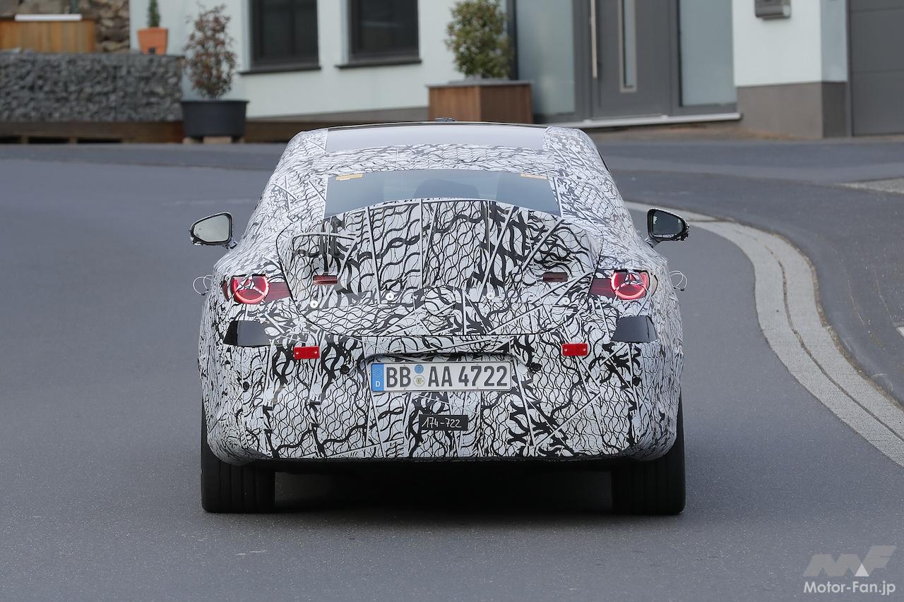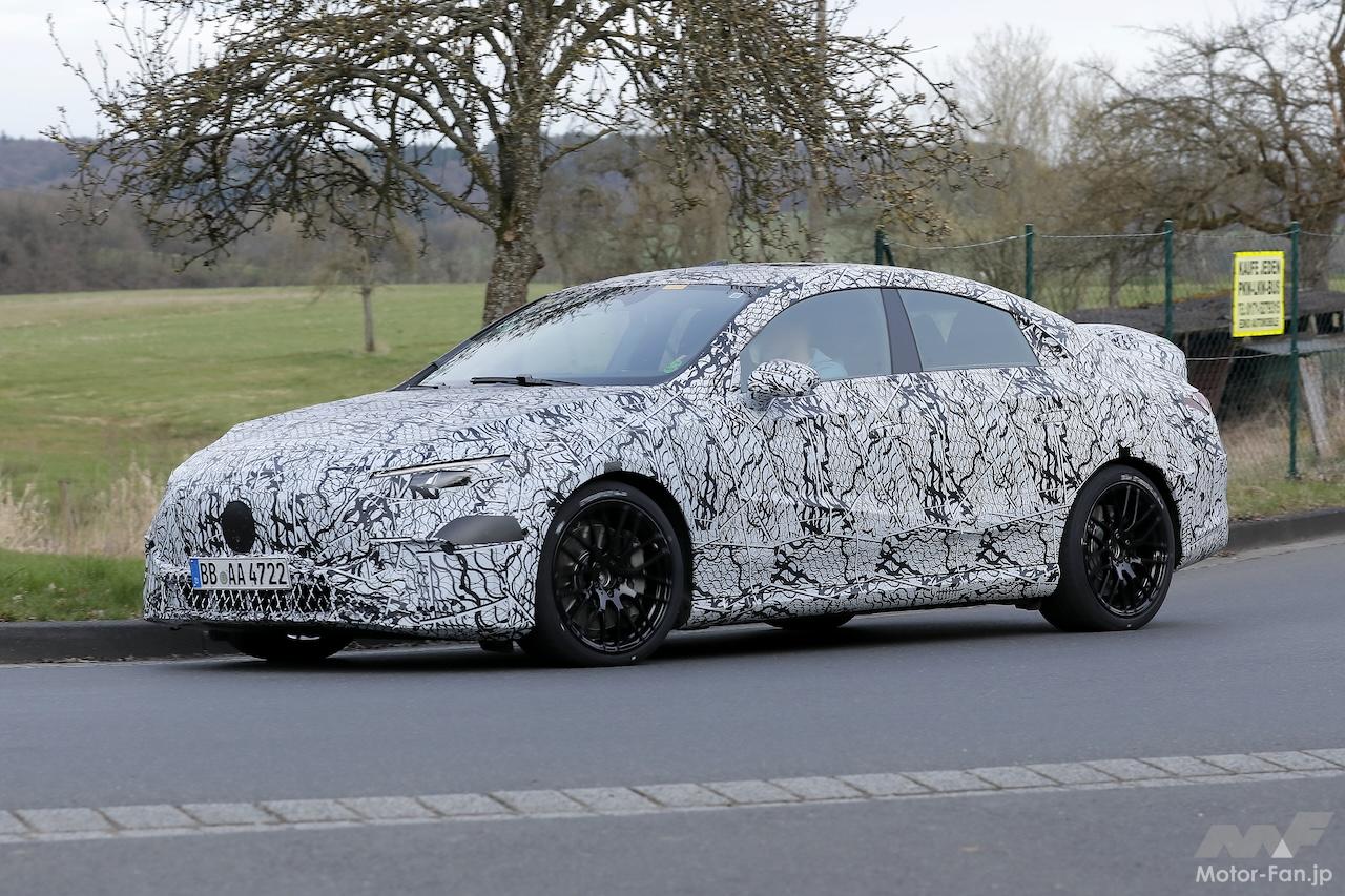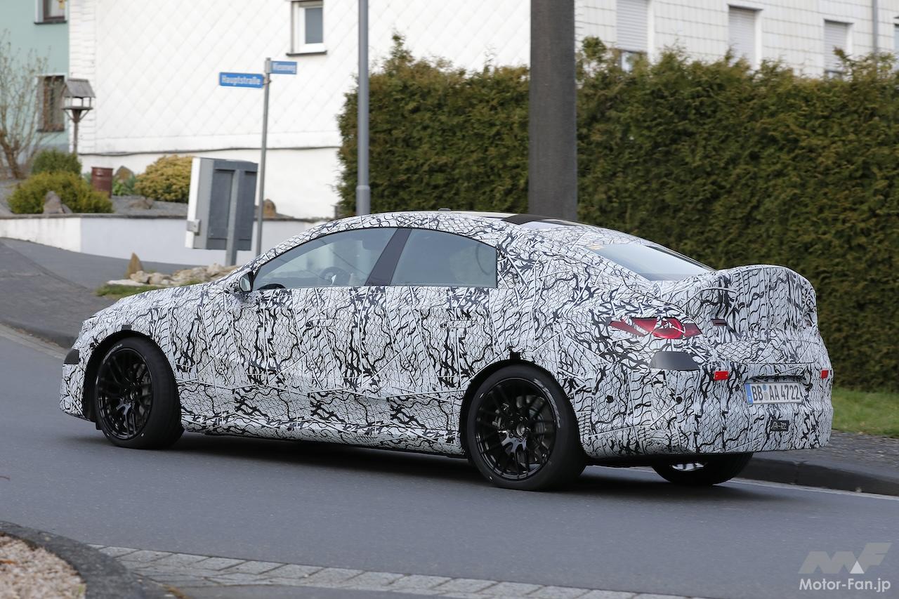 足回りには大きなレーキディスクや、フロントアクスルのローターをグリップする、6ピストンのモノブロックキャリパーのように見えるものが見てとれる。後部には、厳重にカモフラージュされた巨大ダックテールスポイラーを装着しているが、おそらくこれはダミーで、その下に高性能アクティブスポイラーが隠されていると思われる。またエキゾーストパイプが見当たらないことから、エレクトリックAMGモデルとみて間違いないだろう。