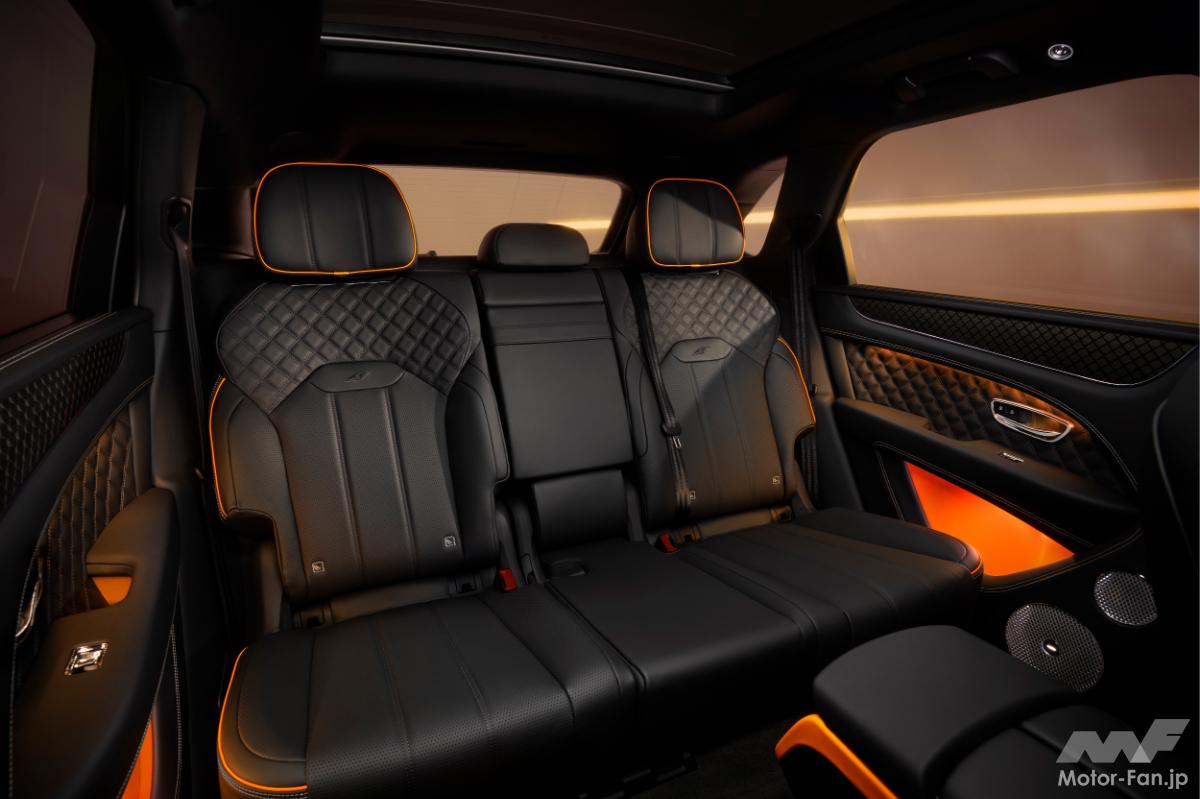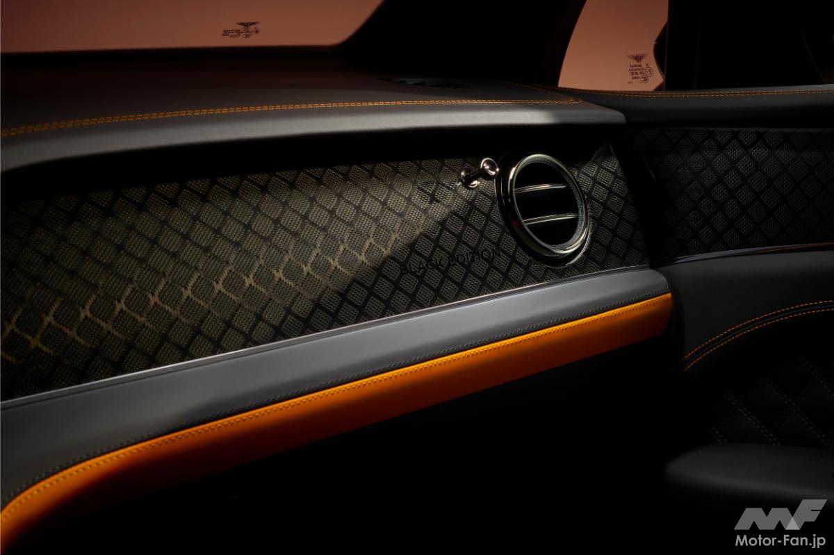 新型ベンテイガS ブラック・エディションでは、ベントレーのデザインチームが独自のインテリア・カラーレイアウトを考案し、リッチなベルーガレザーと鮮やかなアクセントカラーのコントラストを実現している。フェイシア、センターコンソール、ウェストレールには、新しいカーボンファイバー織物が使用されている。この織り目はフェイシアに立体的な奥行きを与えている。さらに、インテリアの金属ディテールの多くが、新しくグロスブラックに変更され、シックな雰囲気を醸している。