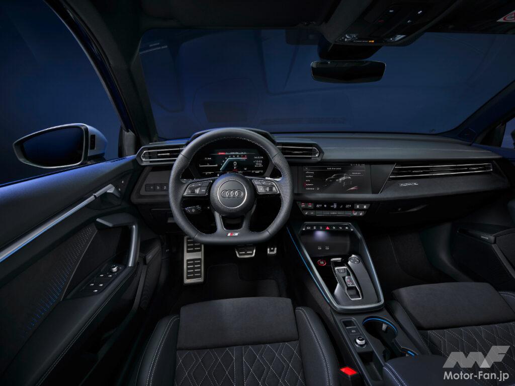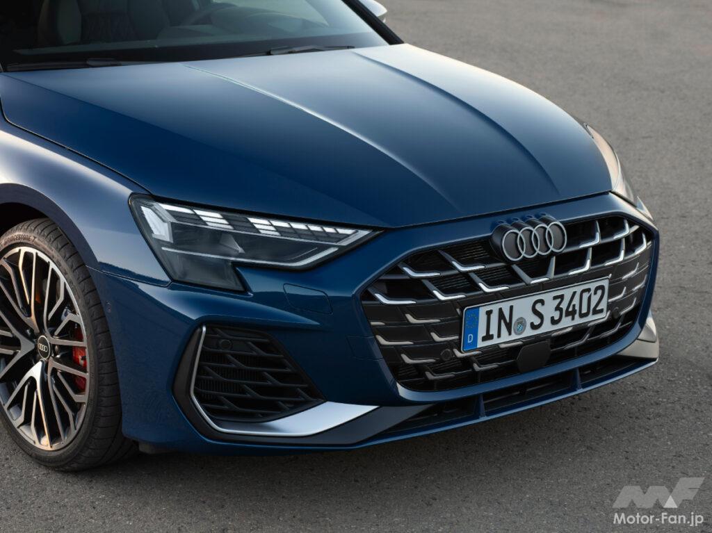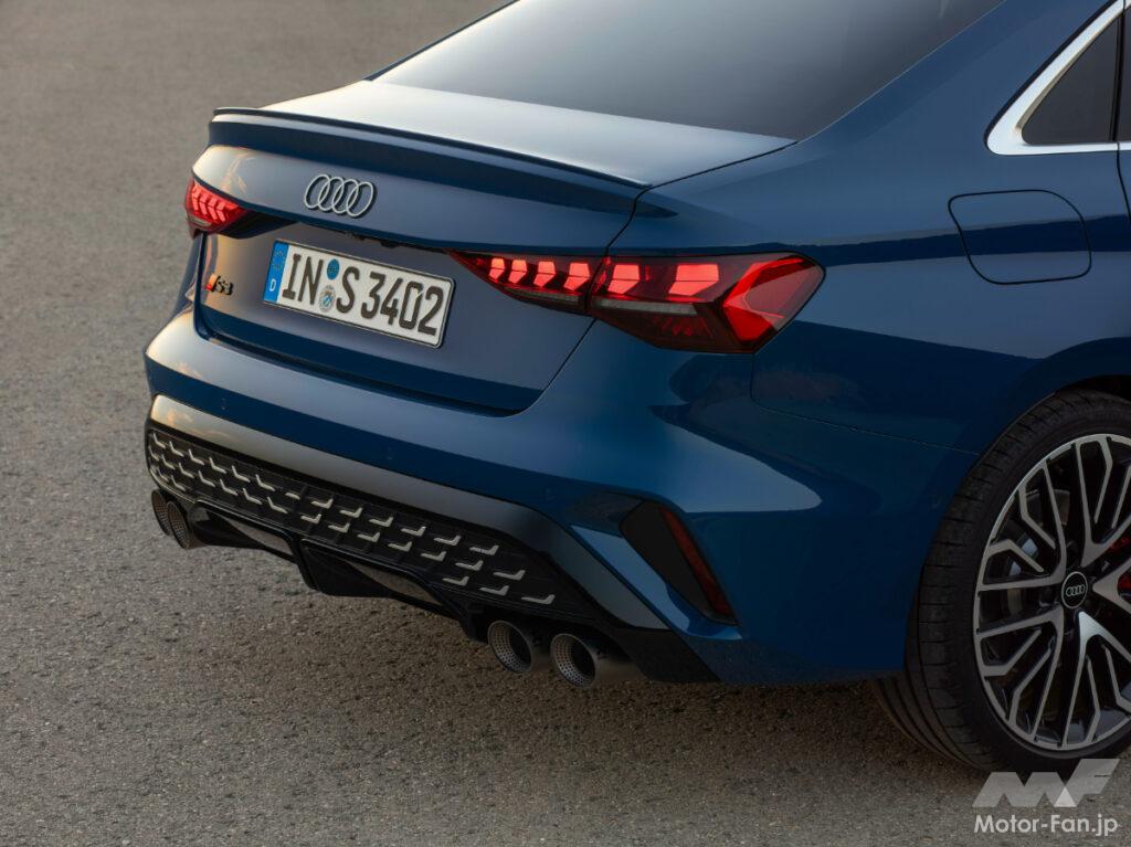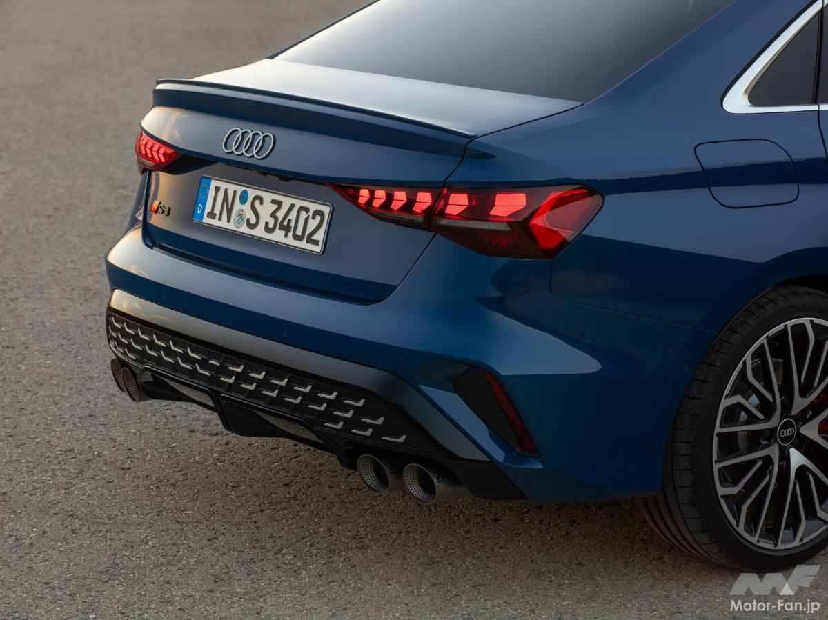エクステリアのスタイリングでは、よりフラットでワイドな形状になった六角形のフレームレス・シングルフレームが特長的だ。L字型のデザインエレメントがボリューム感のあるグリルを強調し、大型のサイドエアインテークとともに、アウディS3のダイナミックなキャラクターを印象付けている。ディフューザー上の光沢ブラックのリヤエプロンは、特徴的なL型ウイングを備えたシングルフレームの形状を反映。Sモデルのもう1つの特徴となっている4本出しのテールパイプによって、ダイナミックな外観のイメージがさらに強化されている。