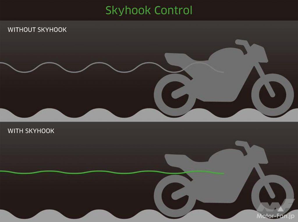 バイク自体の動きを自らが正確に把握する6軸IMU (慣性計測装置)の情報とも連携して統合制御され、バイクの速度やサスペンションの動き(ストロークスピード)も考慮して適切な減衰力に自動制御され、それはブレーキング時のピッチング(ノーズダイブ)抑制にも貢献してくれる。