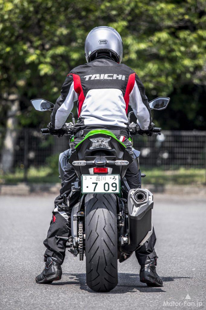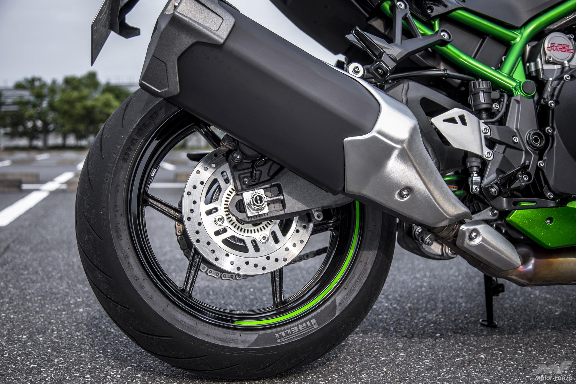 一般公道では、その本来のポテンシャルを試しようがないが、H2 SXと比較するとドリブンスプロケットが2丁増しの46丁を装着。つまり2次減速比が低め。また最大トルク発生回転数はそれより1000rpm低い8500rpmになっていることからも推察できる通り、実用域でのダッシュ力はそれを凌ぐ勢いである事は間違いない。