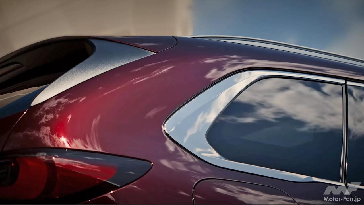 具体的には、CX-80のテールは伸びてより直立し、キャビンも新設計される。ティザーイメージを見ると、厚みのあるクロームベゼルに囲まれたリアサイドウィンドウはCX-80の特徴であり、リアドアからテールゲートまでの距離も延長されている。またリアウィンドウはCX-60と比べて傾斜が少ないが、LEDテールライトは同じように見える。