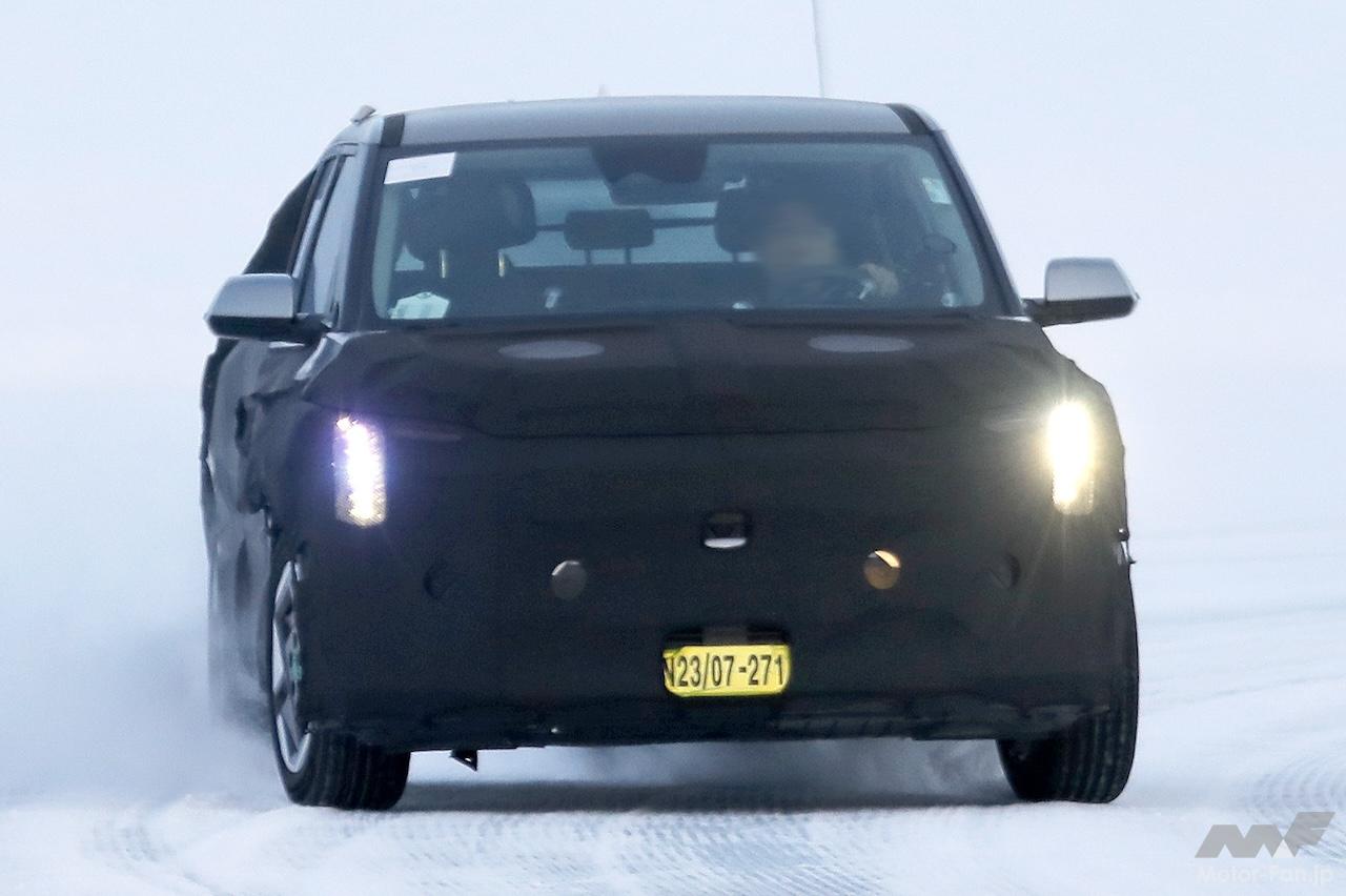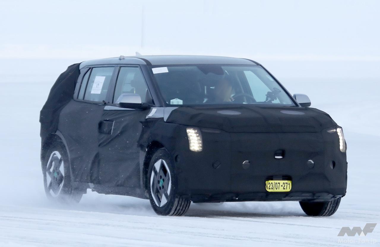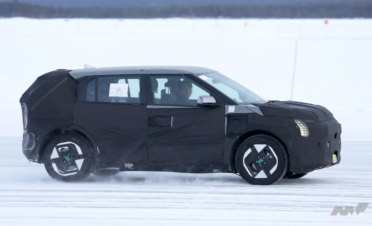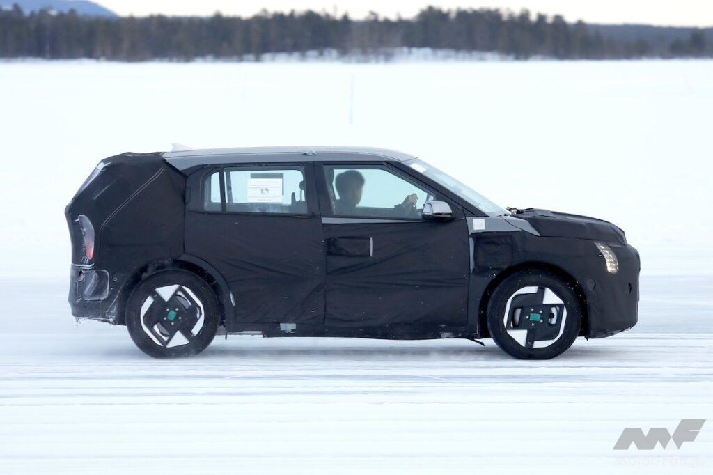 スウェーデンで捉えられた起亜EV3のプロトタイプは、ボディのほとんどをマスクでカモフラージュしているが、コンパクトボディながらホイールベースがかなり長いことがわかる。また兄貴分のEV9からインスピレーションを得た垂直ヘッドライトが装備されていることが確認できる。