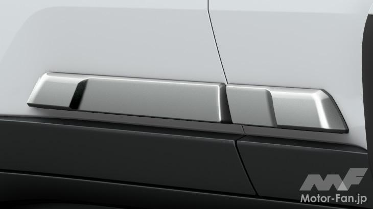 ベース車のキャラクターラインと融合したスタイリッシュなデザインのオーバーフェンダー。表面処理は、金属調またはボデーカラーが選択可能となっている。金属調にすることで、上質さと、力強いオフロード感を演出。ボデーカラー同色とすることで、シティーライクなモダンな印象に。