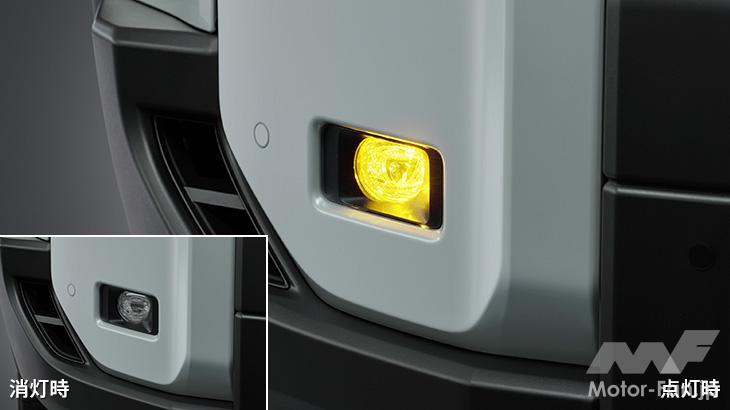 イエローに発光するLEDフォグランプ。悪天候時の運転をサポートする。