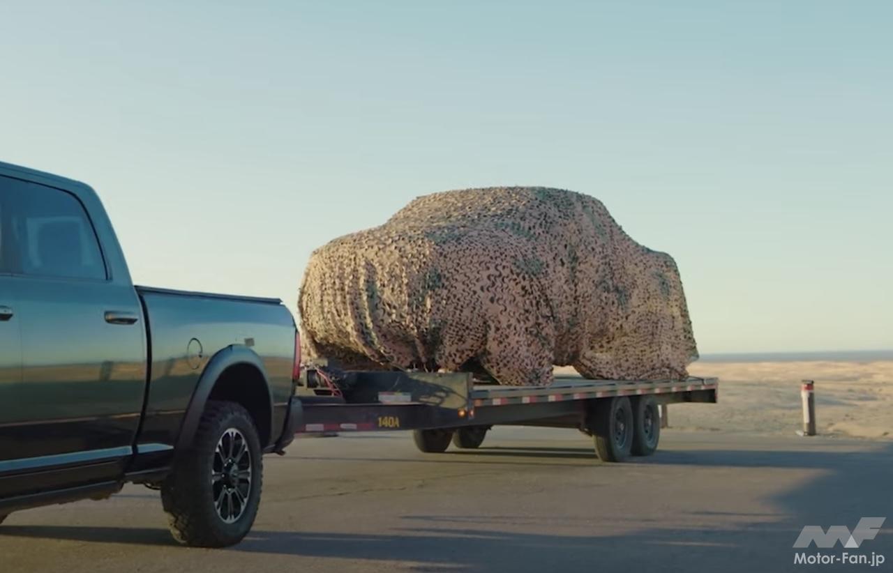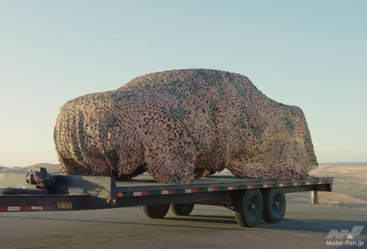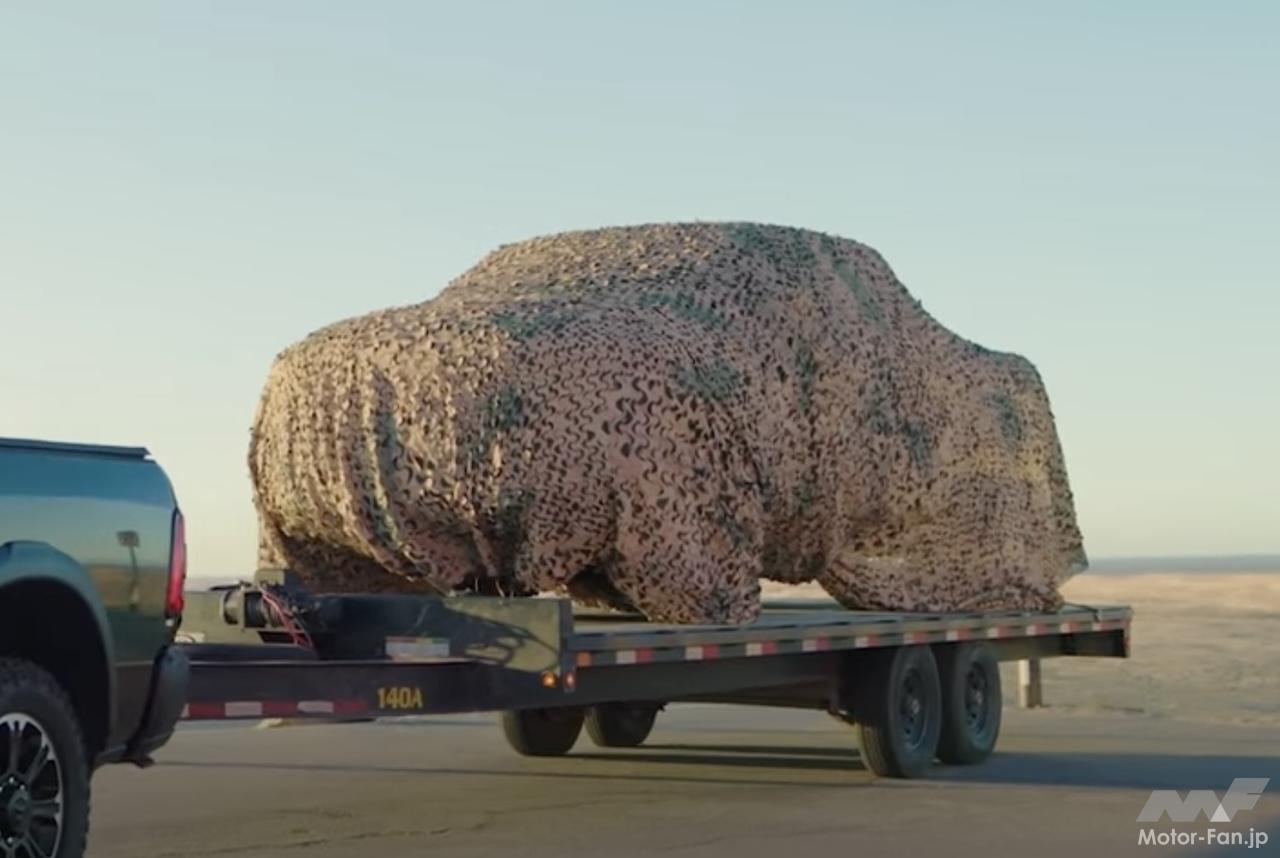 ティザーイメージはカバーで完全に隠されているが、捉えたプロトタイプは、パワードームスタイルのボンネットや、インテーク内部にある3つの琥珀色のライトが確認できる。側面ではオフロードタイヤを装着、十分な地上高が見てとれるほか、後部ではデュアルエキゾーストパイプがインストールされている。
