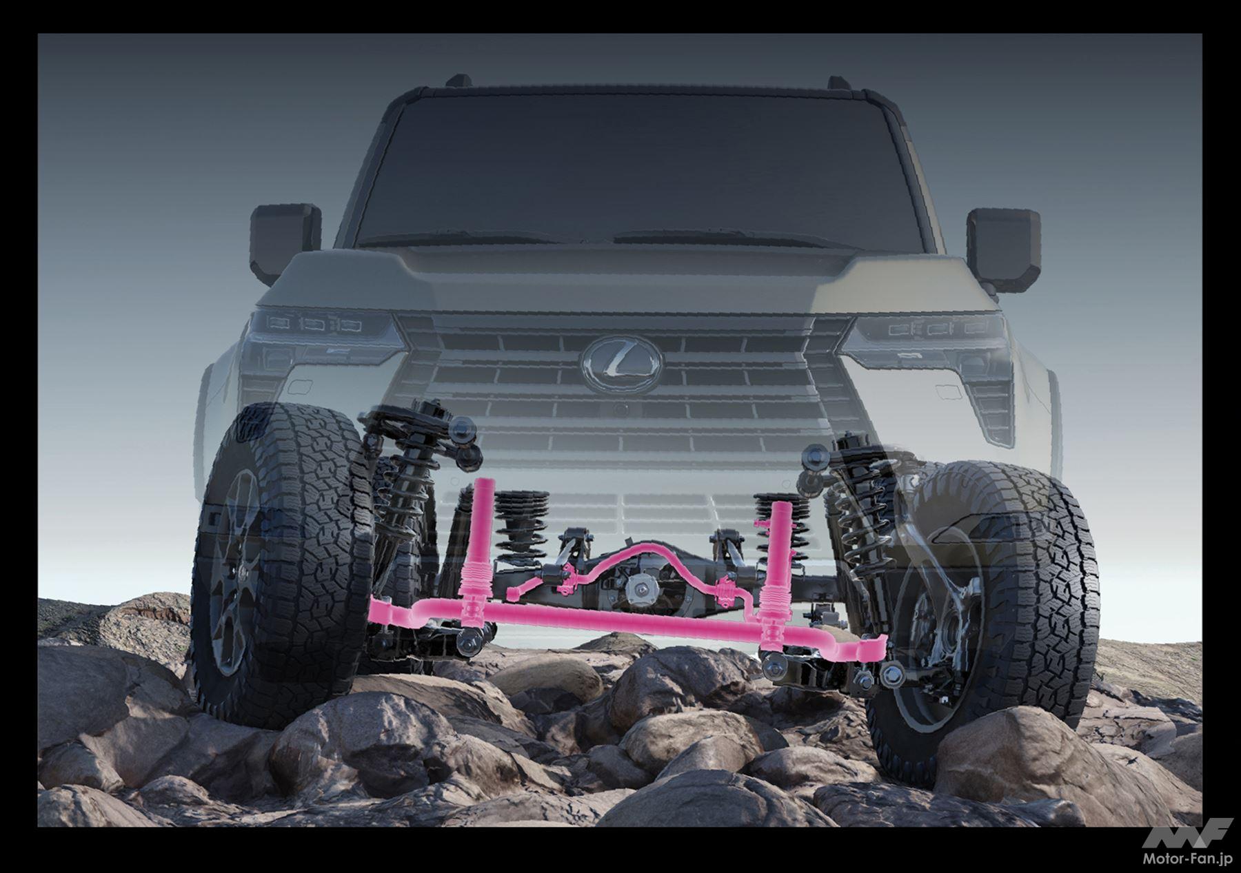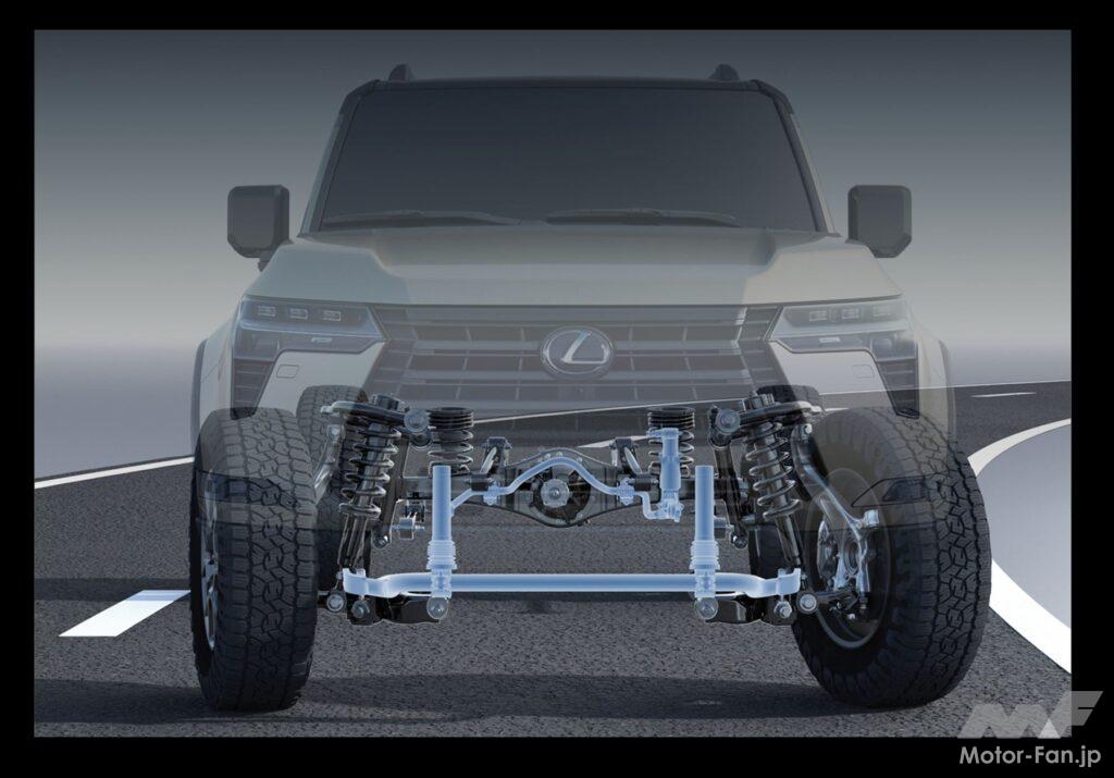 ランドクルーザー250がフロントスタビライザーのロックとフリーを切り替えるSDM(Stabilizer with Disconnection Mechanism)を装備。それに対し、GXはランドクルーザー300シリーズでも採用される、前後のスタビライザーを独立して電子制御するE-KDSS(Electronic-Kinetic Dynamic Suspension System)が奢られている。