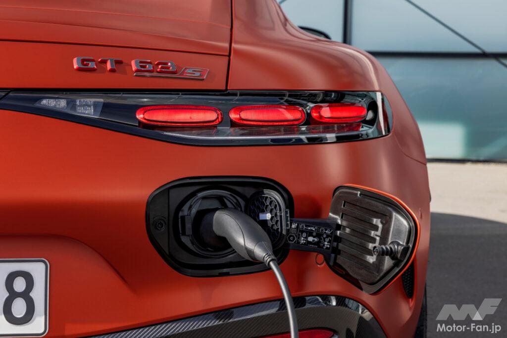 新しいAMG GTシリーズの特長はリヤセクションのプラグインの給電口および赤く強調されたバッジだ。ハイブリッドには、10本スポークデザインの20インチAMGライトアロイホイールが標準で装着される。エアロダイナミクスに最適化されたこのホイールは、タンタルグレーに塗装され、光沢仕上げが施されている。エクステリアは、多数のアピアランス・パッケージでさらに強調することができるほか、さまざまなデザインとカラーバリエーションの20インチ軽合金ホイールと21インチ鍛造ホイールも用意されている。