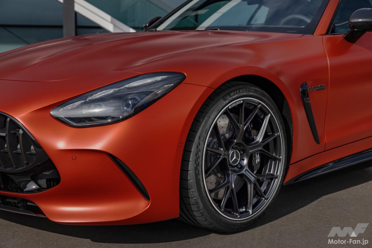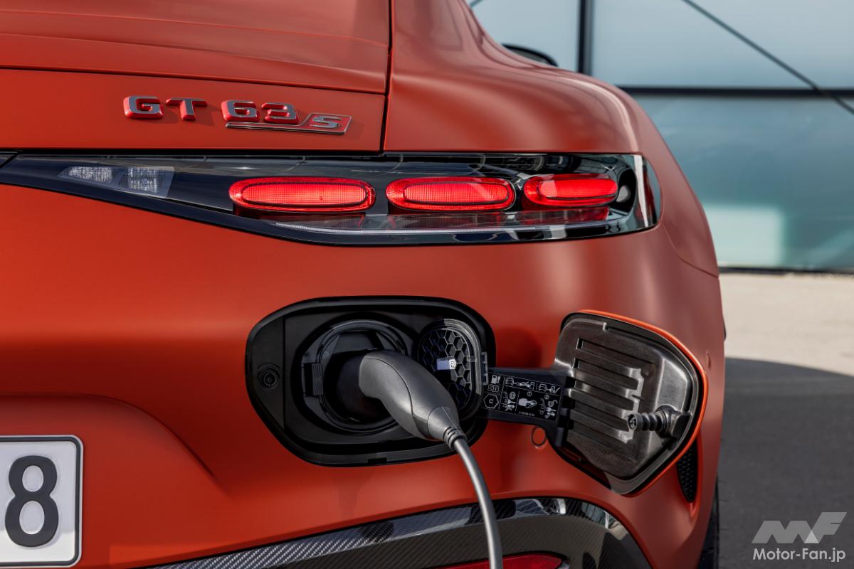 新しいAMG GTシリーズの特長はリヤセクションのプラグインの給電口および赤く強調されたバッジだ。ハイブリッドには、10本スポークデザインの20インチAMGライトアロイホイールが標準で装着される。エアロダイナミクスに最適化されたこのホイールは、タンタルグレーに塗装され、光沢仕上げが施されている。エクステリアは、多数のアピアランス・パッケージでさらに強調することができるほか、さまざまなデザインとカラーバリエーションの20インチ軽合金ホイールと21インチ鍛造ホイールも用意されている。