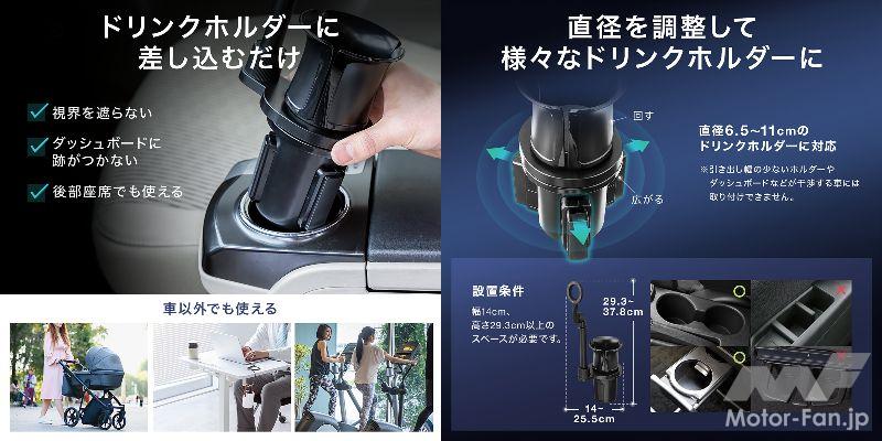 『200-CAR104』は直径6.5~11cmのドリンクホルダーに差し込んで装着ができ、上部にはドリンクホルダー機能も備える。後席だけでなくクルマ以外のドリンクホルダースペースでも利用が可能だ。構造上、設置場所周囲には幅14cm、高さ29.3cm以上のスペースが必要となる。