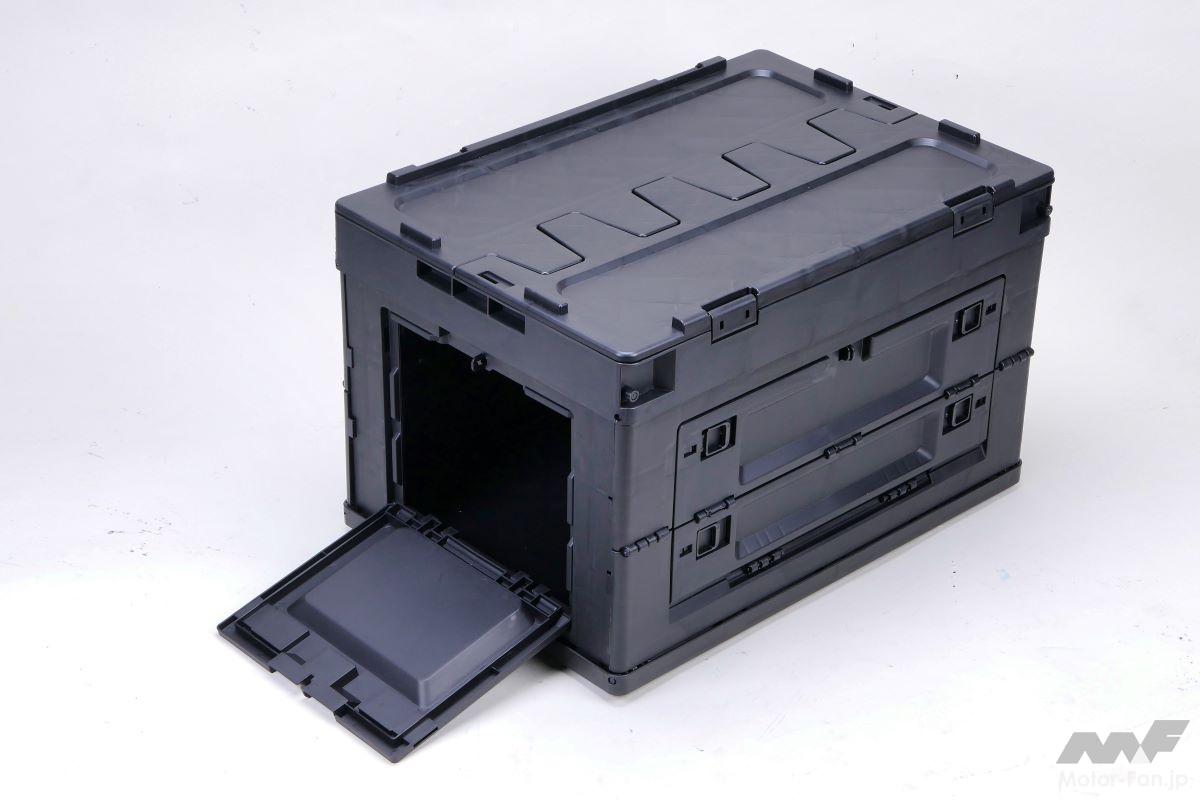 コンテナ自体は頑丈な樹脂製で、重量も軽量。また、使用しないときには折りたたんでコンパクトサイズにすることも可能なので、クルマのラゲッジルームやトランク内の端にさりげなく置いて置ける。