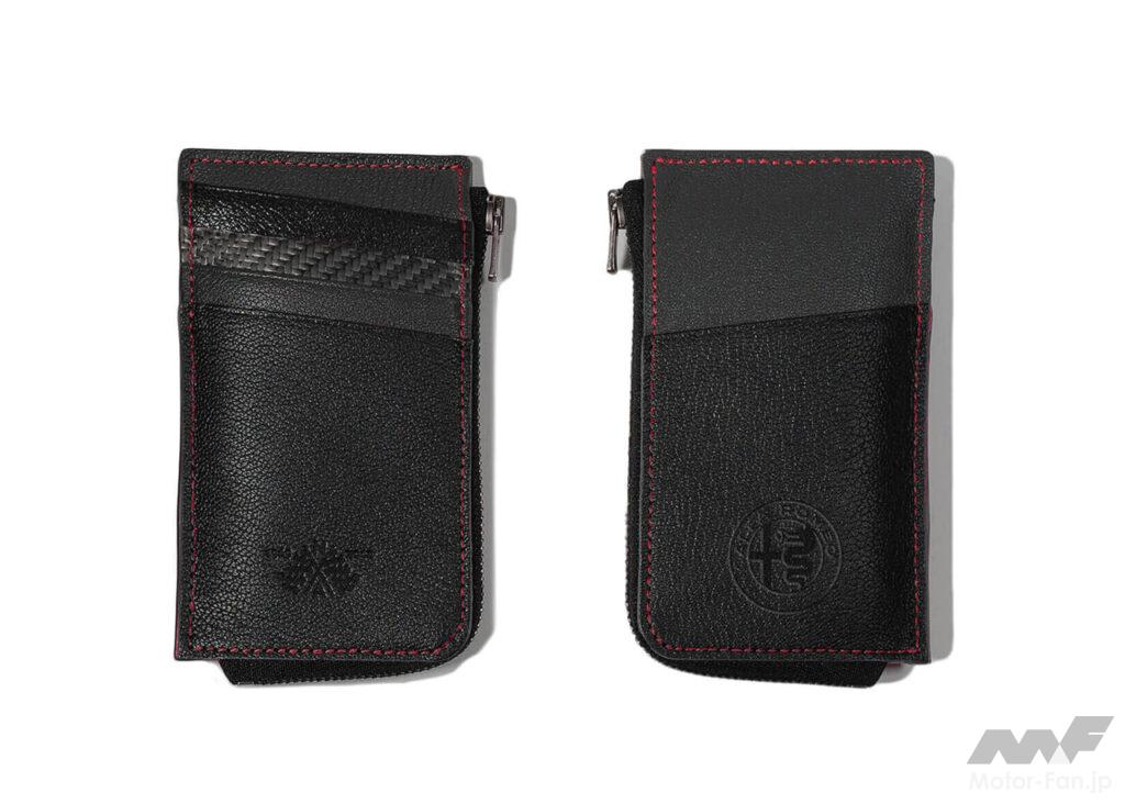 また、アルファロメオのロゴをあしらった、NEGRONI(ネグローニ)社製のオリジナル レーシングストライプウォレットも特別装備。レーシングストライプから着想したバイカラーのボディには、ゴートレザーとラミネートカーボンファイバーを贅沢に使用している。