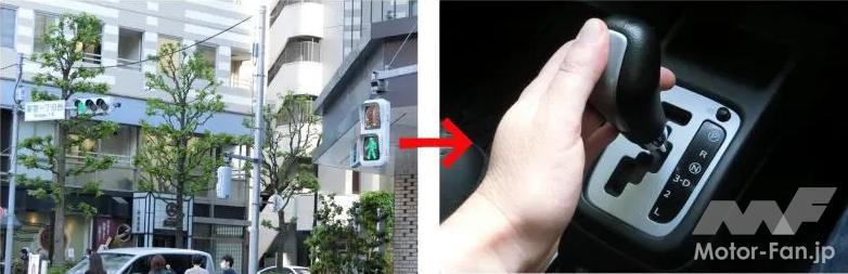 赤く灯る信号の下に停まったとき、交差する歩行者信号が青点滅または赤であればDのままにする。交差側自動車用信号が黄色→赤に変わり、こちらが青になるのは時間の問題だからだ。