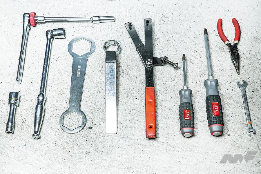 一般的な工具のほかに、回り止めのためのロックレンチやシザーズホルダー(中央の2点)、クラッチナット専用レンチを用意した。