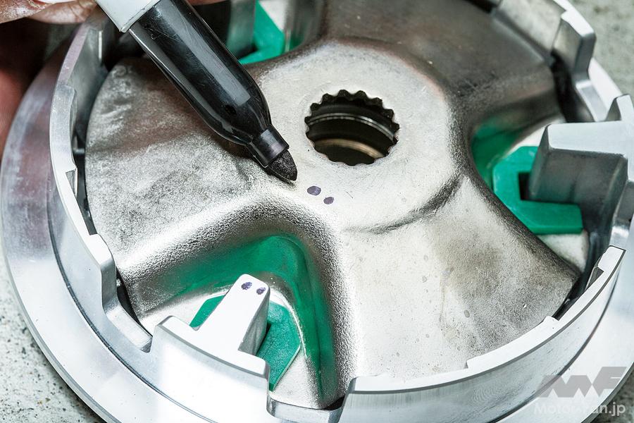 まあでも、僕がそう感じたのはスクーターの駆動系事情を把握していないからで、取材に協力してくれたエムファクトリーの三保田さんによると、現状でも整備と部品交換を行なう意義は十分にあるという。なお今回は準備していなかったけれど、加速性能を左右する重要部品、ドリブン側に備わる3本のクラッチスプリングと巨大なセンタースプリングも、定期的な交換が必要な消耗品だ。