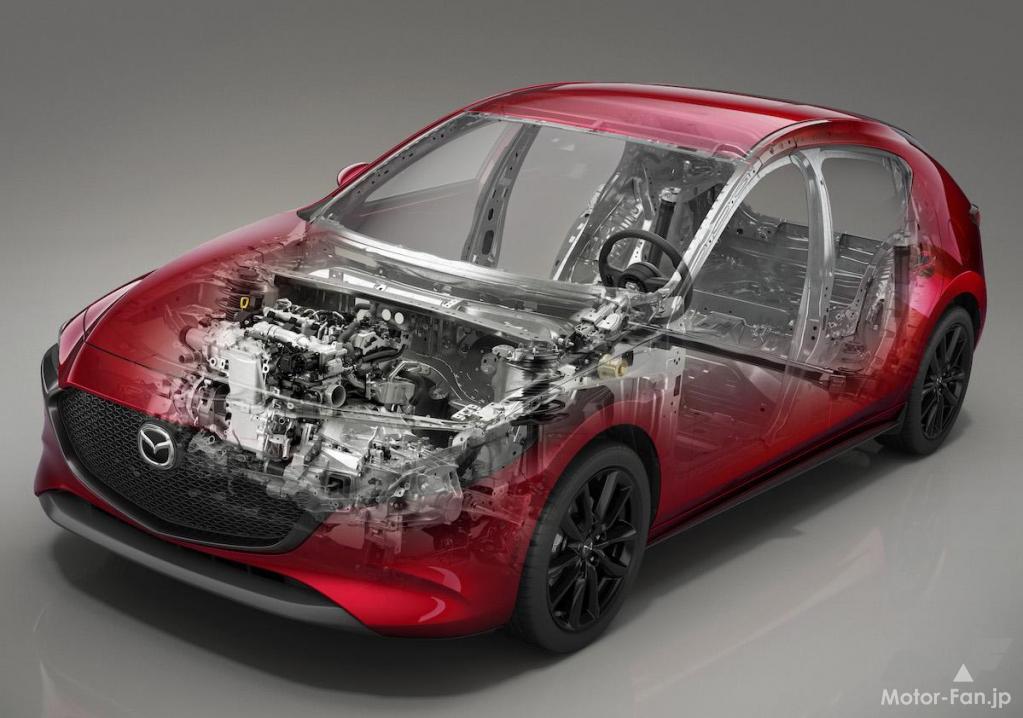 ロサンゼルス・モーターショーで衝撃のデビューを飾ったMazda3(マツダ3=アクセラ)。注目度がもっとも高いのは、SPCCI燃焼という革新的な燃焼技術を投入した「SKYACTIV-X」エンジンで、マツダが「M Hybrid」と呼ぶハイブリッド・システムを搭載している。