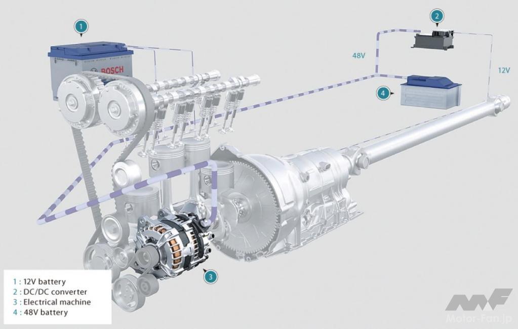 まず、24という数字の意味である。これは大型商用車で用いられている電装と同値であり、信頼性に富んでいる。すなわち欧州勢が採用を急いでいる48Vが完全に新しいシステムであり、今なおデバイス群の研究開発が進んでいる状況に対して、ここは大きなアドバンテージである。しかしM Hybridについては、ここには大きな意味はないかもしれない(理由は後述)。