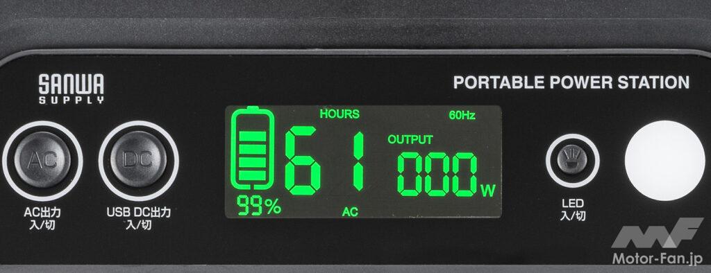 本体前面には電池残量や消費電力、残り時間使用目安等を確認できる視認性に優れたLCD表示パネルを装備。上面には使い勝手の良い折りたたみ式ハンドルが組み込まれている。