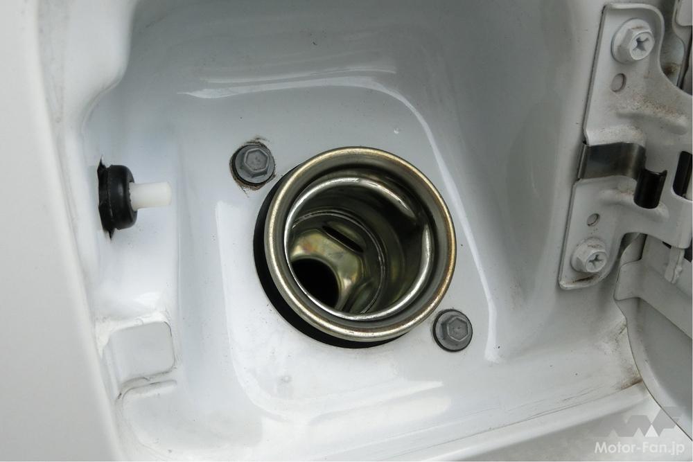 こちら3代目キューブ(2012年型)の給油キャップを外したところ。パイプ外周を樹脂が取り囲んでいる。