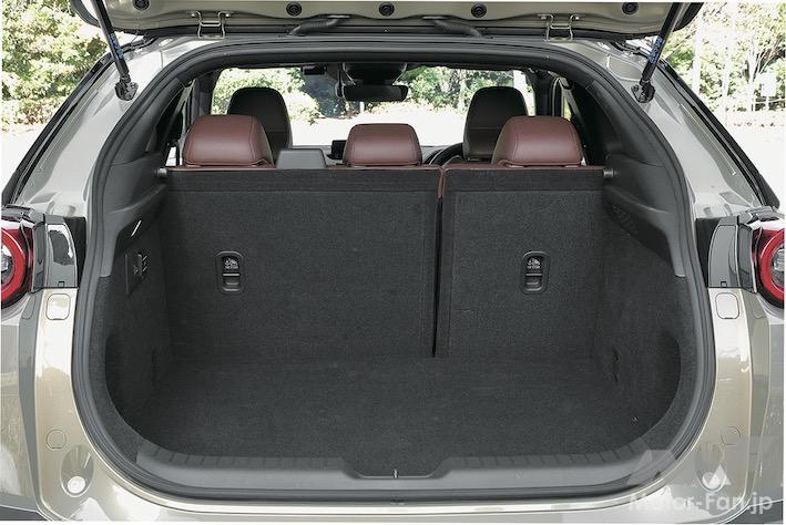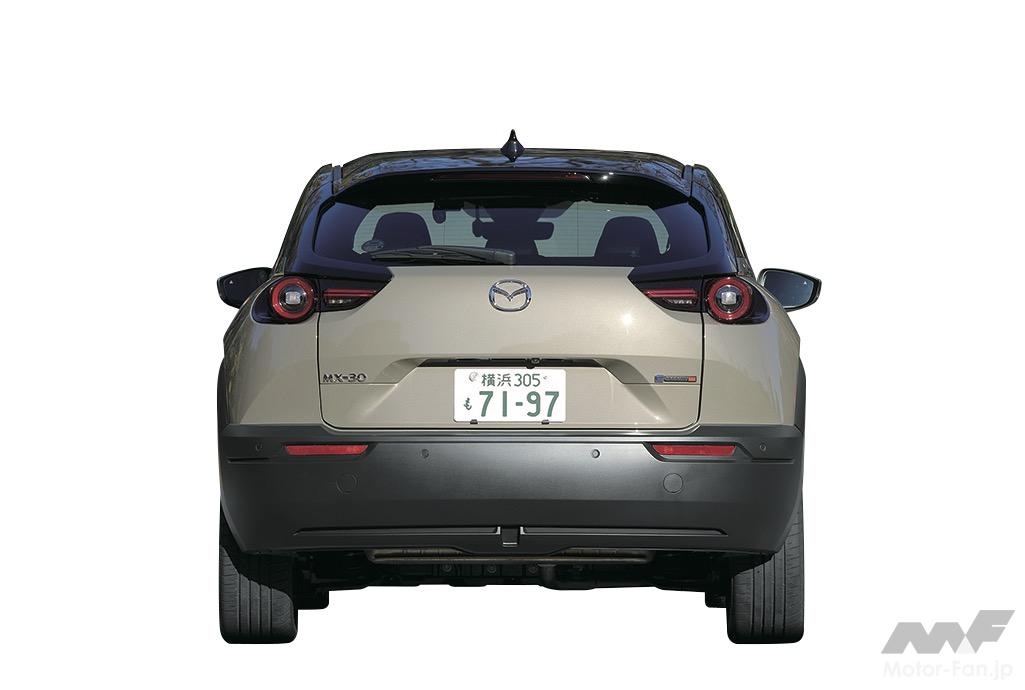 それはパワーユニットにも表れており、発売された際には24Vのマイルドハイブリッドを、続いて電気自動車(EV)を用意。いずれもマツダの量産車初の試みだった。ただしEVはバッテリー搭載量が少なく、1回の充電で走れる距離(航続距離)が256㎞と短い。そこで用意されたのが、プラグイン・ハイブリッド(PHEV)のMX-30ロータリーEV。外部から充電した電力で107㎞走れ、充電した電力を使い切ったあとは、ロータリーエンジンで発電しながら走れる。ガソリンタンク容量は50ℓあり、ハイブリッド走行時のWLTCモード燃費は15.4㎞だから、単純計算で航続距離は877㎞。実力がこの70%だとしても、約614㎞を無給油で走ることができる。