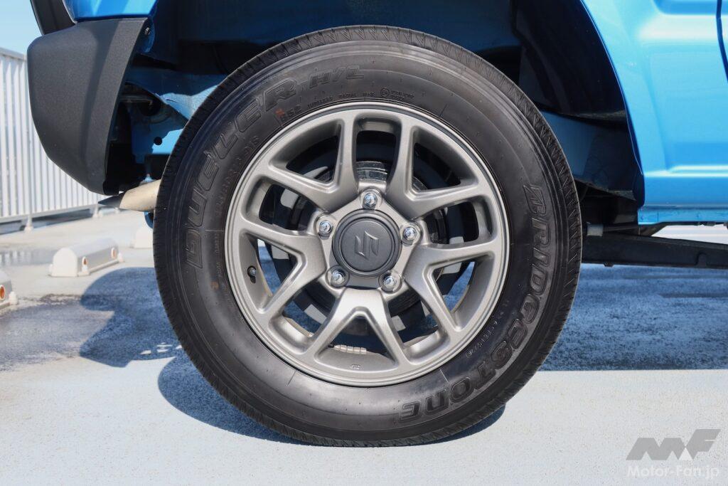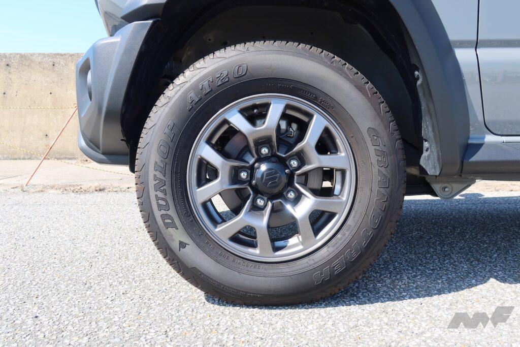 タイヤサイズはジムニーが175/80R16サイズなのに対し、シエラは195/80R15と2サイズワイド。最小回転半径はジムニーの4.8mに対し、シエラは4.9mである。