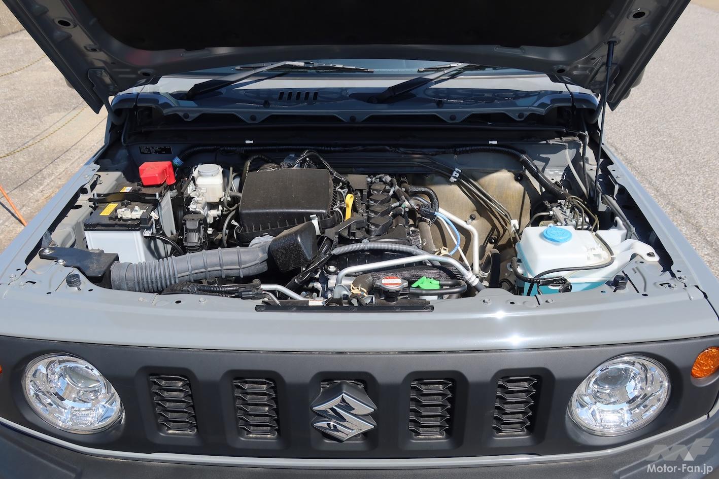 シエラはK15B型の1.5L直列4気筒NAエンジンを搭載。102ps(75kW)の最高出力と130Nmの最大トルクを発生する。ジムニーに対する40kgの重量の違いよりも、38ps(28kW)と34Nmのスペックの違いのほうが大きく、走らせていてストレスを感じない。エンジンが発する力に余裕があるので、常用回転数は明らかに低い。