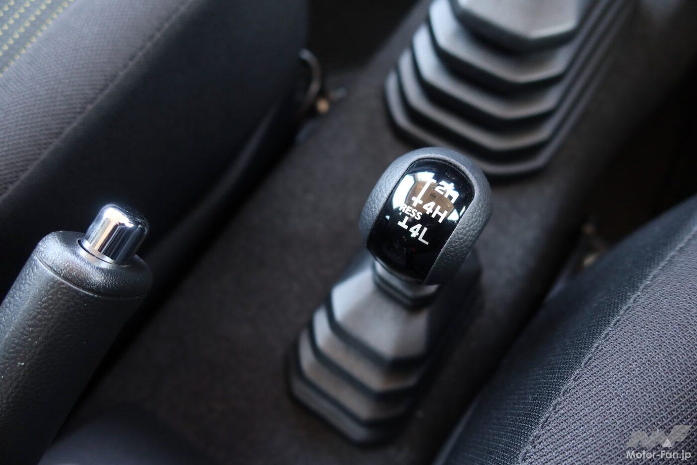 居住空間は基本的に共通だ。シエラは小型車だが、軽自動車のジムニーと同じで乗車定員は4名である。(ラック&ピニオンではなく)ボールナット式のステアリング機構も同じなら、フロント、リヤともに3リンク・リジッドアクスルのサスペンション形式も共通。ハイ/ローを切り換える副変速機を備えたパートタイム4WDの駆動システムも共通だ。通常は2H(2WD、FR)で走り、雪道や荒れ地は4H(4WD高速)、急な登坂路や悪路ではトランスファーレバーを操作して4L(4WD低速)にして走るのが推奨である。