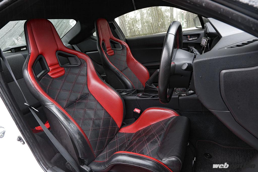 高級感のあるシートは、レカロ・スポーツスターリミテッドエディション。ホールド性が高さはもちろん、長距離ドライブでも疲労感は少ないのが魅力だ。レーシングハーネスにはHPI製をチョイスしている。