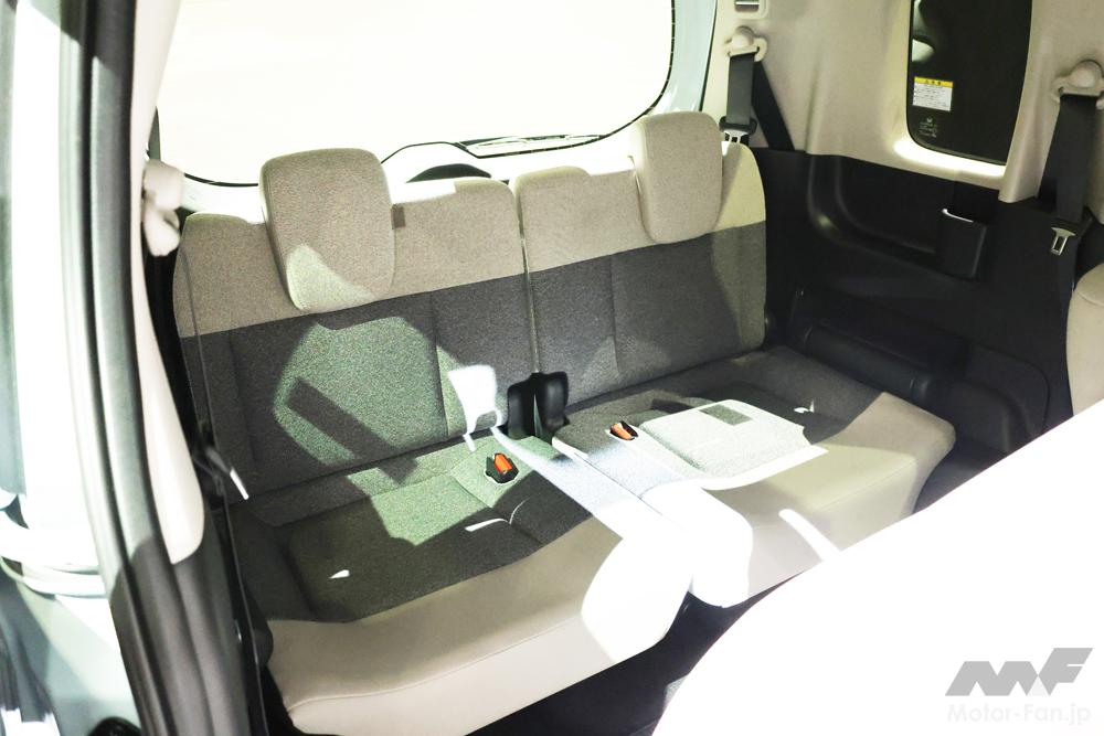 もっとも、跳ね上げ式のままでも改良は施されていて、跳ね上げ時のシート上端位置を90mm下げた地上1390mmに抑え(ということは、現行はガラスをまるまるふさいでいたわけだ。)、座面下の「脚」の収納状態も可能な限り平滑化に努めてほぼ直立(と開発陣は語ったが、実物は完全に垂直だった!)するなどの工夫で跳ね上げ時の左右間幅も160mm拡大している。90mm下げたり160mm上げたりと、機構もボディ外寸も変えずにこれだけの寸法を稼ぐのだって並大抵の苦労ではない。シートの収容法や荷室サイズの制約に不満を抱いていた現行型ユーザーが、新型のこの寸法差を大きな違いとして感じ取ることができたなら、それは設計担当者の苦労の賜物だ。