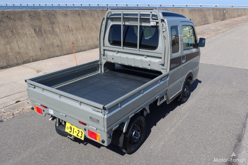 キャビンを拡大すると心配になるのは荷台の使い勝手だが、よく考えられている。キャビン後部の床を持ち上げることで下に空間を設け、荷台床面前方をキャビン側に浸食させたのだ。この2段構造を採用した結果、荷台フロア長はキャリイ比−55mmの1975mmを確保。この寸法なら脚立やみち板(足場板)などの長尺物はキャリイと同様に積むことができる。キャビンと干渉しない部分の荷台長は1480mmあるので、自転車程度のサイズなら積載可能だ。