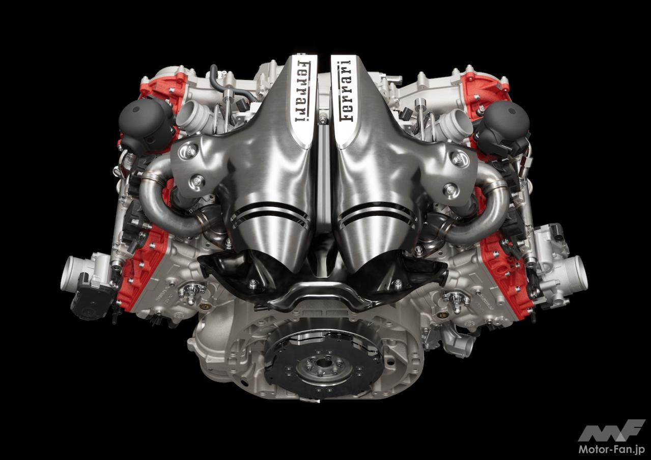 広いVバンク間に設置されるターボチャージャーはモノスクロールタイプで、IHI製だ。左右で逆回転するターボの最高回転数は180,000rpm。コンプレッサーホイールの直径は3.9ℓ・V8ターボ比で5%、タービンホイールは11%低減したという。その効果で回転要素のイナーシャは11%低減しており、回転上昇に要する時間は短縮されているとフェラーリは説明している。エキゾーストマニフォールドの材料はF1のエキマニでもおなじみのインコネル製で、耐熱性の高さと軽さからの採用だ。