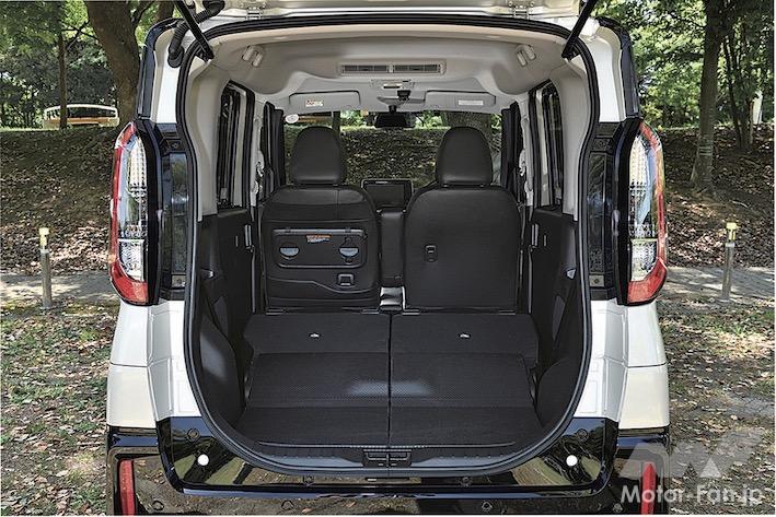 室内の広さは他社のスーパーハイト系に遜色はなく、後席のスライド量は320㎜とクラストップ。後席を折り畳んだ際の荷室長は1480㎜なので、大人が横になるのは厳しいが、前後席ともヘッドレストを外して、前席背もたれを後ろへ、後席背もたれを前に倒せば2mくらいの前後長は確保できる。あとは凹凸を埋める工夫をすれば、大柄な大人の車中泊も可能だ。