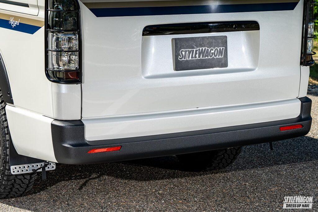フロント側が純正バンパーに被せるハーフタイプのスポイラー、リアに関しては純正バンパーと組み替えるフルバンパー形状を採用しており、フロントスポイラーに関してはバンパー両サイドに仕込まれた牽引フックも利用可能で、ワイルド感を生むブルバーの装着にもひと役買っている。