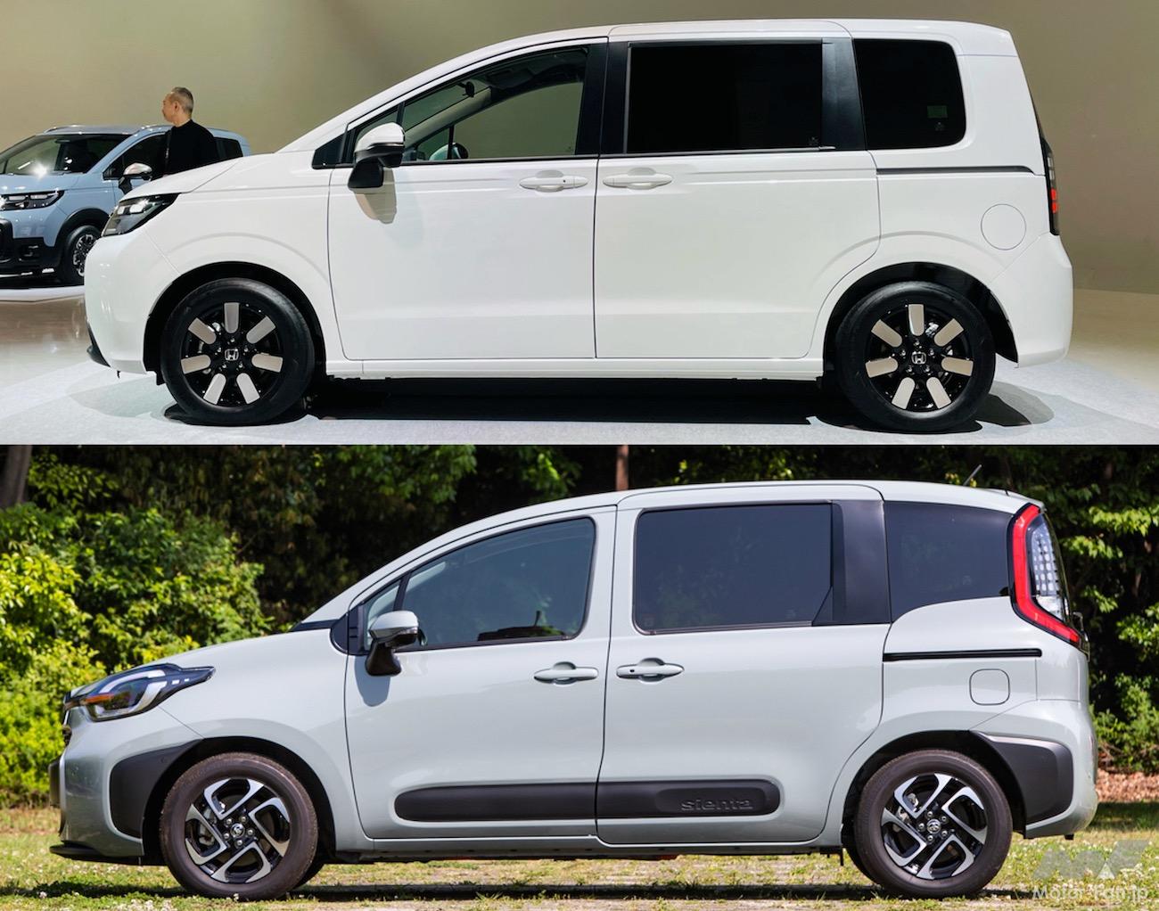 また、直線基調のフリードに対し、曲線的なシエンタと、キャラクターも異なっている。B・Cピラーをブラックアウトし、Dピラーを太いカラードにしたフリードはウインドウ全体をひとつに見せているが、シエンタはA・Bピラーをカラーに、Cピラーをブラックアウト、Dピラーをリヤコンビネーションランプで隠す複雑な構成をしつつフローティングルーフ的な演出をしているのも両車の違いだ。