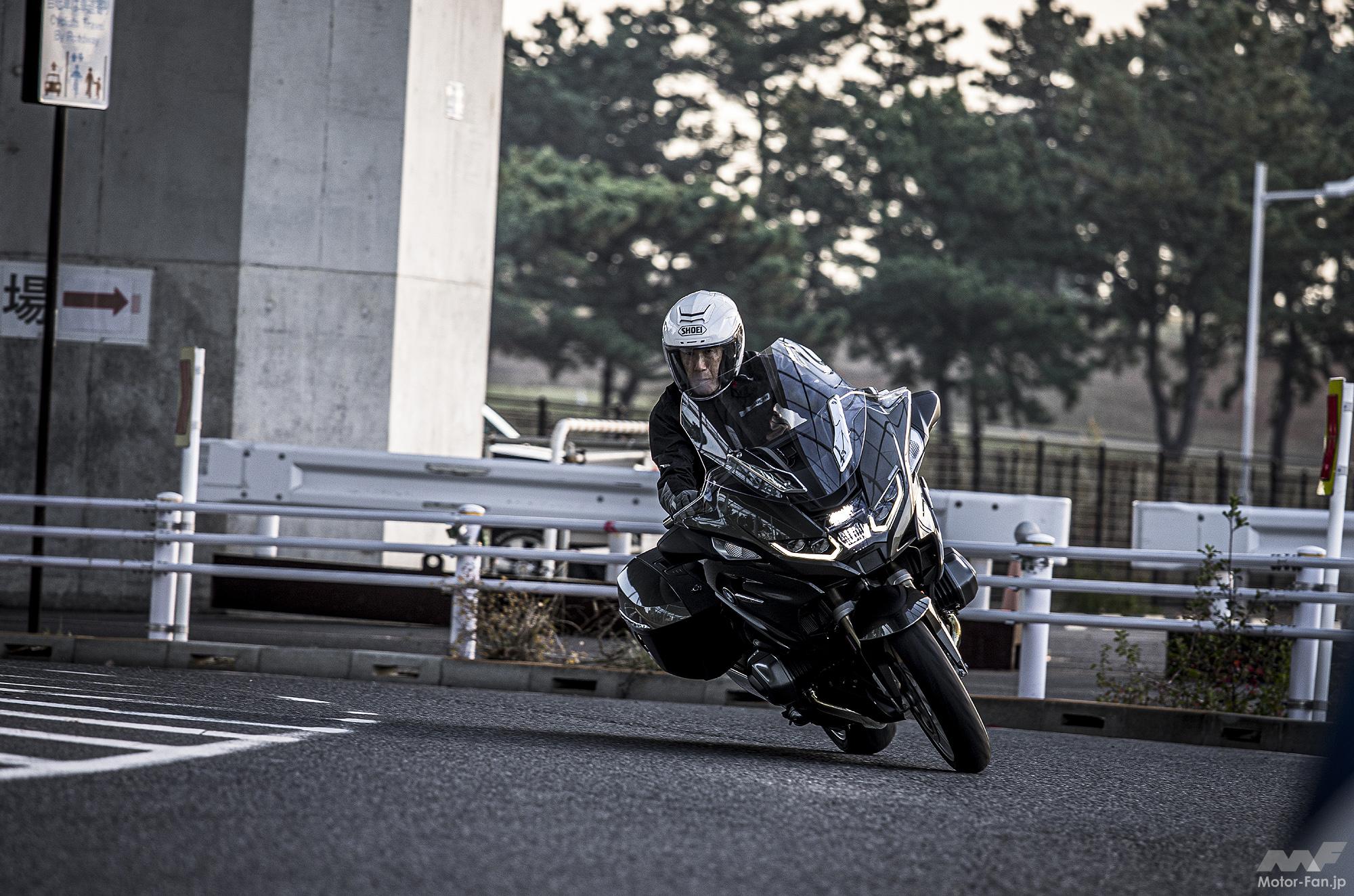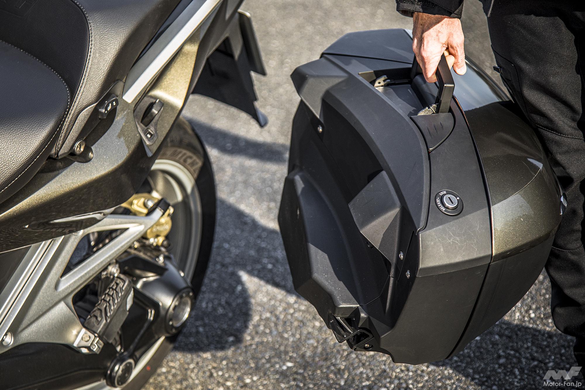 直進性に優れ常にどっしりと落ち着いた挙動に終始する安定性はもちろん、高速レーンから離れてランプウェイのコーナーを抜けるのも、あるいは峠道を行くのも扱いはとても素直で軽い。ただ、元気の良いスポーツバイクと比較するとバイクの挙動は常にしっとりと穏やか。クイックに身を翻すタイプでないと言う事、ゆったりと扱う事が大切である点は忘れないよう、常に意識しておきたい。普段の乗り味が快適ゆえ、ライダーの気持ちが寛ぎ過ぎていまわない(油断しない)ように注意が必要だと思えた。それだけ“楽~”に走れたと言う事なのである。