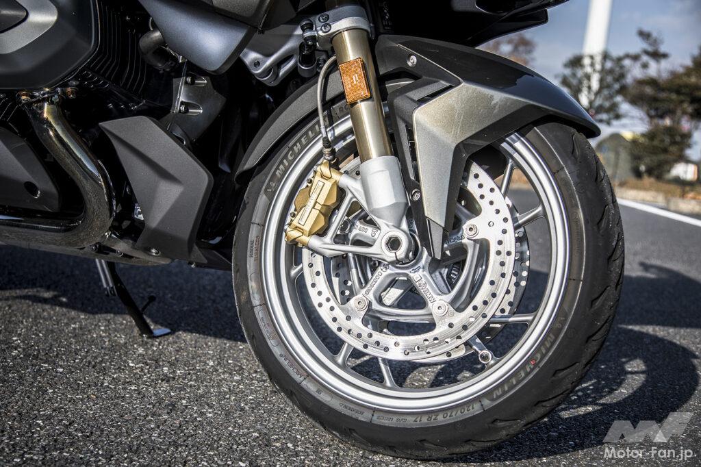 一見は普通の倒立フォークだが、テレレバーと呼ばれるBMW独自のストラット式サスペンションが採用されている。車体側からリーディングアームが伸びフォークブラケットを支持し、衝撃吸収や減衰はモノショックユニットで担う仕組み。ダブルディスクブレーキは、φ320mmのフローティングローターに対向4ピストンの油圧キャリパーがラジアルマウントされている。