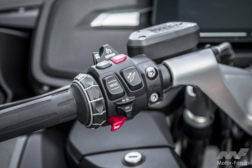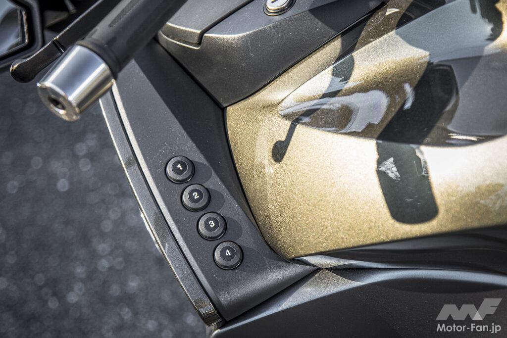 フロントカウルとスクリーンはミラーも含めてウインドプロテクションに熟成が重ねられたデザインが施されている。ヘッドライト下の中央には前方の障害物を把握するレーダーが組み込まれている。