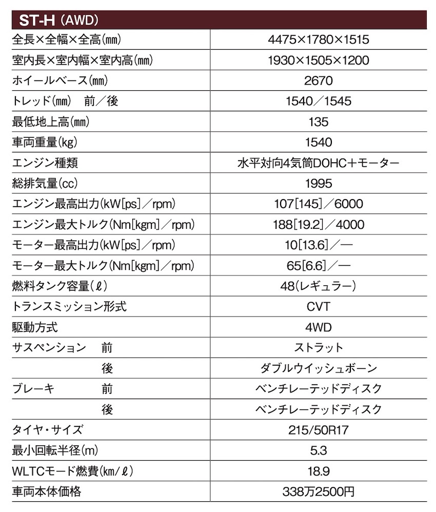 ボディサイズは、純粋なスバルラインナップの中で、いちばんコンパクトなモデルとなるが、全長4475㎜×全幅1780㎜と、正直なところコンパクトカーと呼ぶには少々大きめ。パワートレインも、水平対向4気筒2.0ℓエンジンのモーターの有無×FFまたはAWDという組み合わせ。カテゴライズ的には、もはやコンパクトカーの領域には入りにくいクルマとなってしまった。しかし、使い勝手の面では、コンパクトカーの主舞台である街なかで十分使いやすいものとなっている。例えば、AWDで17インチタイヤを履いているにもかかわらず、最小回転半径は5.3m。日常の利便性に重きが置かれているのがわかる。